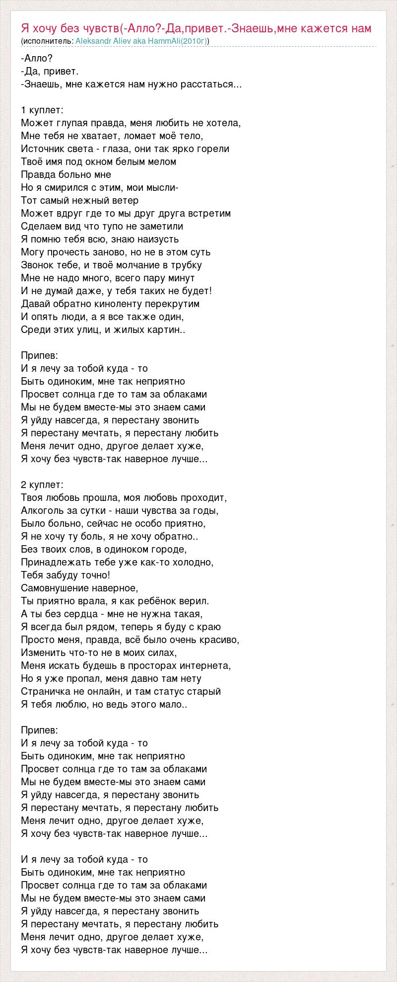 -Алло? -Да, привет. -Знаешь, мне кажется нам нужно расстаться... 1 куплет: Может глупая правда, меня любить не хотела, Мне тебя не хватает, ломает моё тело, Источник света - глаза, они так ярко горели Твоё имя под окном белым мелом Правда больно мне Но я смирился с этим, мои мысли- Тот самый нежный ветер Может вдруг где то мы друг друга встретим Сделаем вид что тупо не заметили Я помню тебя всю, знаю наизусть Могу прочесть заново, но не в этом суть Звонок тебе, и твоё молчание в трубку Мне не надо много, всего пару минут И не думай даже, у тебя таких не будет! Давай обратно киноленту перекрутим И опять люди, а я все также один, Среди этих улиц, и жилых картин.. Припев: И я лечу за тобой куда - то Быть одиноким, мне так неприятно Просвет солнца где то там за облаками Мы не будем вместе-мы это знаем сами Я уйду навсегда, я перестану звонить Я перестану мечтать, я перестану любить Меня лечит одно, другое делает хуже, Я хочу без чувств-так наверное лучше... 2 куплет: Твоя любовь прошла, моя любовь проходит, Алкоголь за сутки - наши чувства за годы, Было больно, сейчас не особо приятно, Я не хочу ту боль, я не хочу обратно.. Без твоих слов, в одиноком городе, Принадлежать тебе уже как-то холодно, Тебя забуду точно! Самовнушение наверное, Ты приятно врала, я как ребёнок верил. А ты без сердца - мне не нужна такая, Я всегда был рядом, теперь я буду с краю Просто меня, правда, всё было очень красиво, Изменить что-то не в моих силах, Меня искать будешь в просторах интернета, Но я уже пропал, меня давно там нету Страничка не онлайн, и там статус старый Я тебя люблю, но ведь этого мало.. Припев: И я лечу за тобой куда - то Быть одиноким, мне так неприятно Просвет солнца где то там за облаками Мы не будем вместе-мы это знаем сами Я уйду навсегда, я перестану звонить Я перестану мечтать, я перестану любить Меня лечит одно, другое делает хуже, Я хочу без чувств-так наверное лучше... И я лечу за тобой куда - то Быть одиноким, мне так неприятно Просвет солнца где то там за облаками Мы не будем вместе-мы это знаем сами Я уйду навсегда, я перестану звонить Я перестану мечтать, я перестану любить Меня лечит одно, другое делает хуже, Я хочу без чувств-так наверное лучше...