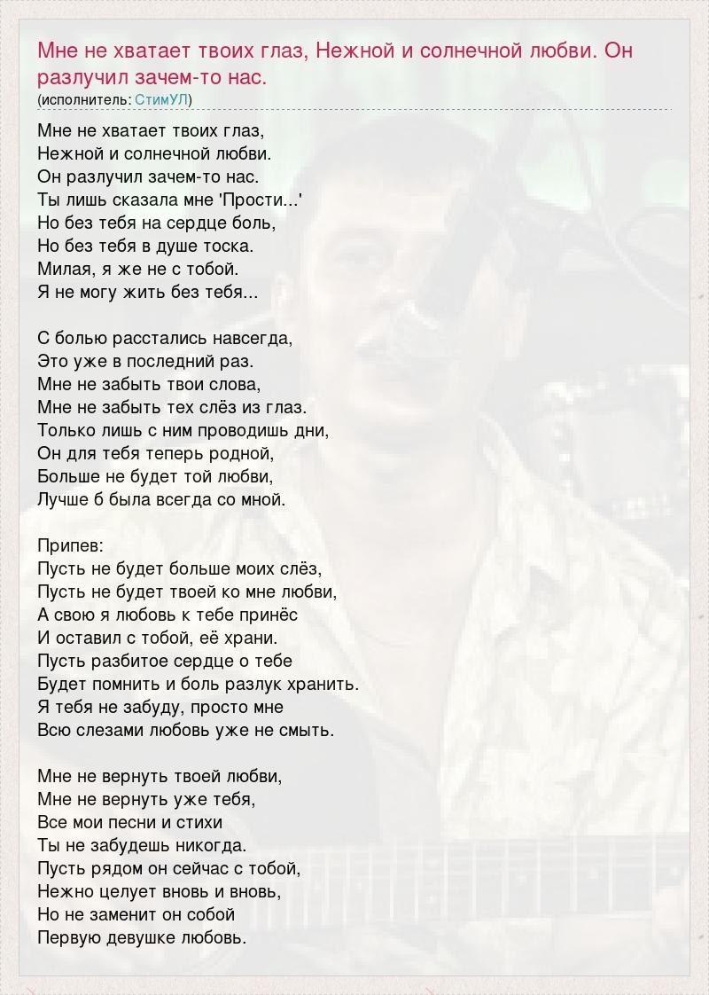 Мне не хватает твоих глаз, Нежной и солнечной любви. Он разлучил зачем-то нас. Ты лишь сказала мне 'Прости...' Но без тебя на сердце боль, Но без тебя в душе тоска. Милая, я же не с тобой. Я не могу жить без тебя... С болью расстались навсегда, Это уже в последний раз. Мне не забыть твои слова, Мне не забыть тех слёз из глаз. Только лишь с ним проводишь дни, Он для тебя теперь родной, Больше не будет той любви, Лучше б была всегда со мной. Припев: Пусть не будет больше моих слёз, Пусть не будет твоей ко мне любви, А свою я любовь к тебе принёс И оставил с тобой, её храни. Пусть разбитое сердце о тебе Будет помнить и боль разлук хранить. Я тебя не забуду, просто мне Всю слезами любовь уже не смыть. Мне не вернуть твоей любви, Мне не вернуть уже тебя, Все мои песни и стихи Ты не забудешь никогда. Пусть рядом он сейчас с тобой, Нежно целует вновь и вновь, Но не заменит он собой Первую девушке любовь.