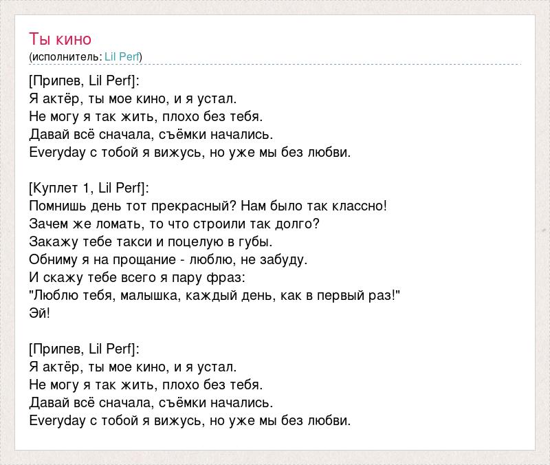 [Припев, Lil Perf]: Я актёр, ты мое кино, и я устал. Не могу я так жить, плохо без тебя. Давай всё сначала, съёмки начались. Everyday с тобой я вижусь, но уже мы без любви. [Куплет 1, Lil Perf]: Помнишь день тот прекрасный? Нам было так классно! Зачем же ломать, то что строили так долго? Закажу тебе такси и поцелую в губы. Обниму я на прощание - люблю, не забуду. И скажу тебе всего я пару фраз: "Люблю тебя, малышка, каждый день, как в первый раз!" Эй! [Припев, Lil Perf]: Я актёр, ты мое кино, и я устал. Не могу я так жить, плохо без тебя. Давай всё сначала, съёмки начались. Everyday с тобой я вижусь, но уже мы без любви.