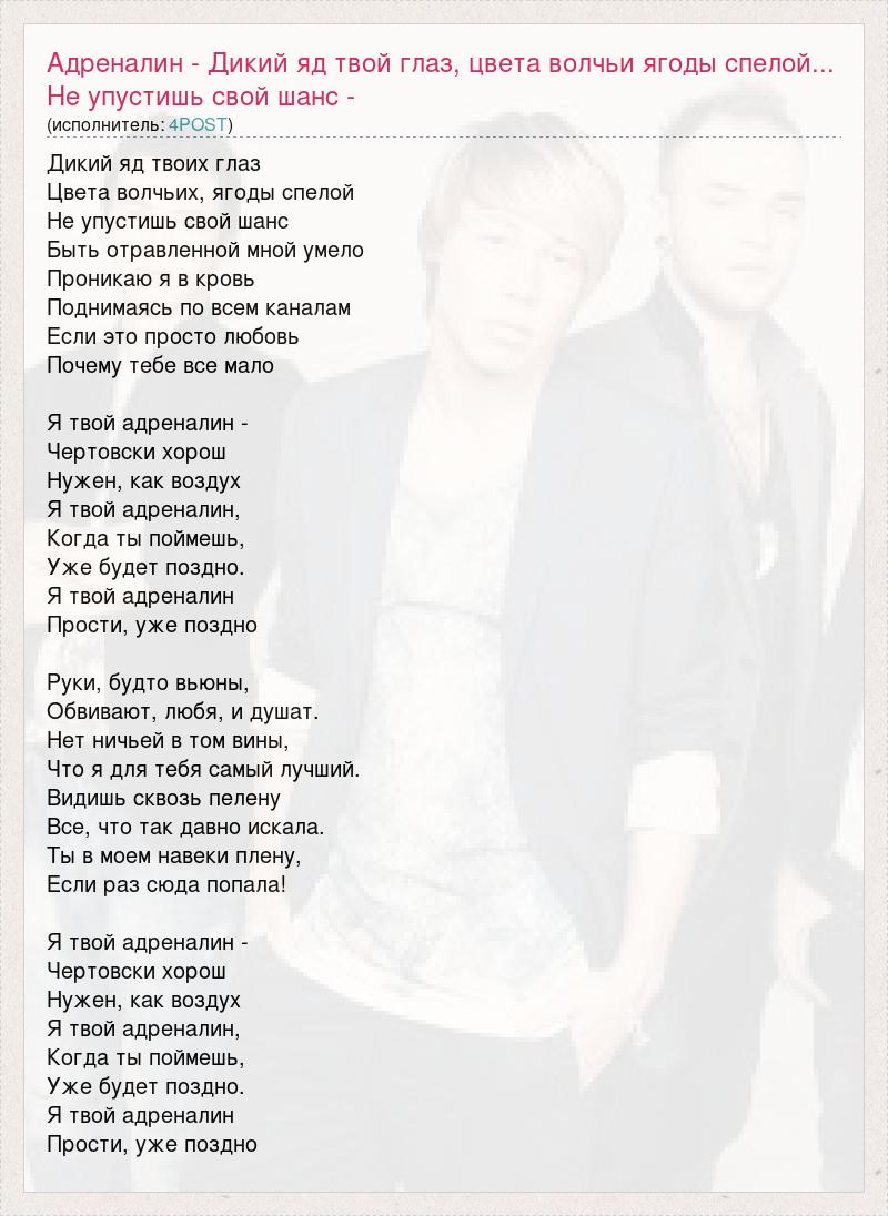 Дикий яд твоих глаз Цвета волчьих, ягоды спелой Не упустишь свой шанс Быть отравленной мной умело Проникаю я в кровь Поднимаясь по всем каналам Если это просто любовь Почему тебе все мало Я твой адреналин - Чертовски хорош Нужен, как воздух Я твой адреналин, Когда ты поймешь, Уже будет поздно. Я твой адреналин Прости, уже поздно Руки, будто вьюны, Обвивают, любя, и душат. Нет ничьей в том вины, Что я для тебя самый лучший. Видишь сквозь пелену Все, что так давно искала. Ты в моем навеки плену, Если раз сюда попала! Я твой адреналин - Чертовски хорош Нужен, как воздух Я твой адреналин, Когда ты поймешь, Уже будет поздно. Я твой адреналин Прости, уже поздно