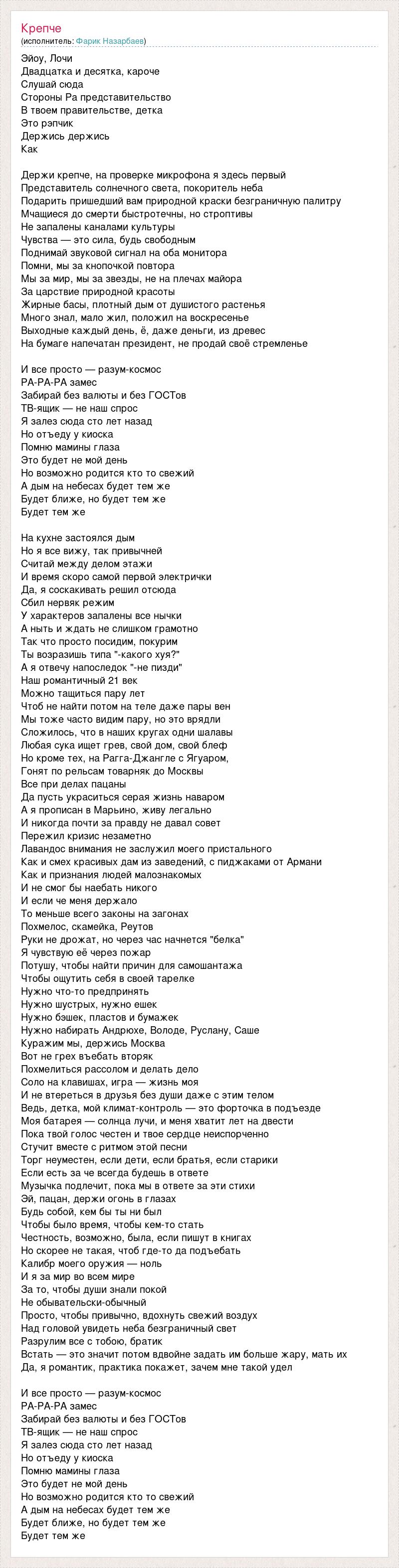 Эйоу, Лочи Двадцатка и десятка, кароче Слушай сюда Стороны Ра представительство В твоем правительстве, детка Это рэпчик Держись держись Как Держи крепче, на проверке микрофона я здесь первый Представитель солнечного света, покоритель неба Подарить пришедший вам природной краски безграничную палитру Мчащиеся до смерти быстротечны, но строптивы Не запалены каналами культуры Чувства — это сила, будь свободным Поднимай звуковой сигнал на оба монитора Помни, мы за кнопочкой повтора Мы за мир, мы за звезды, не на плечах майора За царствие природной красоты Жирные басы, плотный дым от душистого растенья Много знал, мало жил, положил на воскресенье Выходные каждый день, ё, даже деньги, из древес На бумаге напечатан президент, не продай своё стремленье И все просто — разум-космос РА-РА-РА замес Забирай без валюты и без ГОСТов ТВ-ящик — не наш спрос Я залез сюда сто лет назад Но отъеду у киоска Помню мамины глаза Это будет не мой день Но возможно родится кто то свежий А дым на небесах будет тем же Будет ближе, но будет тем же Будет тем же На кухне застоялся дым Но я все вижу, так привычней Считай между делом этажи И время скоро самой первой электрички Да, я соскакивать решил отсюда Сбил нервяк режим У характеров запалены все нычки А ныть и ждать не слишком грамотно Так что просто посидим, покурим Ты возразишь типа "-какого хуя?" А я отвечу напоследок "-не пизди" Наш романтичный 21 век Можно тащиться пару лет Чтоб не найти потом на теле даже пары вен Мы тоже часто видим пару, но это врядли Сложилось, что в наших кругах одни шалавы Любая сука ищет грев, свой дом, свой блеф Но кроме тех, на Рагга-Джангле с Ягуаром, Гонят по рельсам товарняк до Москвы Все при делах пацаны Да пусть украситься серая жизнь наваром А я прописан в Марьино, живу легально И никогда почти за правду не давал совет Пережил кризис незаметно Лавандос внимания не заслужил моего пристального Как и смех красивых дам из заведений, с пиджаками от Армани Как и признания людей малознакомых И не смог бы наебать никого И если че меня держало То меньше всего законы на загонах Похмелос, скамейка, Реутов Руки не дрожат, но через час начнется "белка" Я чувствую её через пожар Потушу, чтобы найти причин для самошантажа Чтобы ощутить себя в своей тарелке Нужно что-то предпринять Нужно шустрых, нужно ешек Нужно бэшек, пластов и бумажек Нужно набирать Андрюхе, Володе, Руслану, Саше Куражим мы, держись Москва Вот не грех въебать вторяк Похмелиться рассолом и делать дело Соло на клавишах, игра — жизнь моя И не втереться в друзья без души даже с этим телом Ведь, детка, мой климат-контроль — это форточка в подъезде Моя батарея — солнца лучи, и меня хватит лет на двести Пока твой голос честен и твое сердце неиспорченно Стучит вместе с ритмом этой песни Торг неуместен, если дети, если братья, если старики Если есть за че всегда будешь в ответе Музычка подлечит, пока мы в ответе за эти стихи Эй, пацан, держи огонь в глазах Будь собой, кем бы ты ни был Чтобы было время, чтобы кем-то стать Честность, возможно, была, если пишут в книгах Но скорее не такая, чтоб где-то да подъебать Калибр моего оружия — ноль И я за мир во всем мире За то, чтобы души знали покой Не обывательски-обычный Просто, чтобы привычно, вдохнуть свежий воздух Над головой увидеть неба безграничный свет Разрулим все с тобою, братик Встать — это значит по