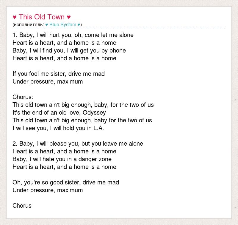 1. Baby, I will hurt you, oh, come let me alone Heart is a heart, and a home is a home Baby, I will find you, I will get you by phone Heart is a heart, and a home is a home If you fool me sister, drive me mad Under pressure, maximum Chorus: This old town ain't big enough, baby, for the two of us It's the end of an old love, Odyssey This old town ain't big enough, baby for the two of us I will see you, I will hold you in L.A. 2. Baby, I will please you, but you leave me alone Heart is a heart, and a home is a home Baby, I will hate you in a danger zone Heart is a heart, and a home is a home Oh, you're so good sister, drive me mad Under pressure, maximum Chorus