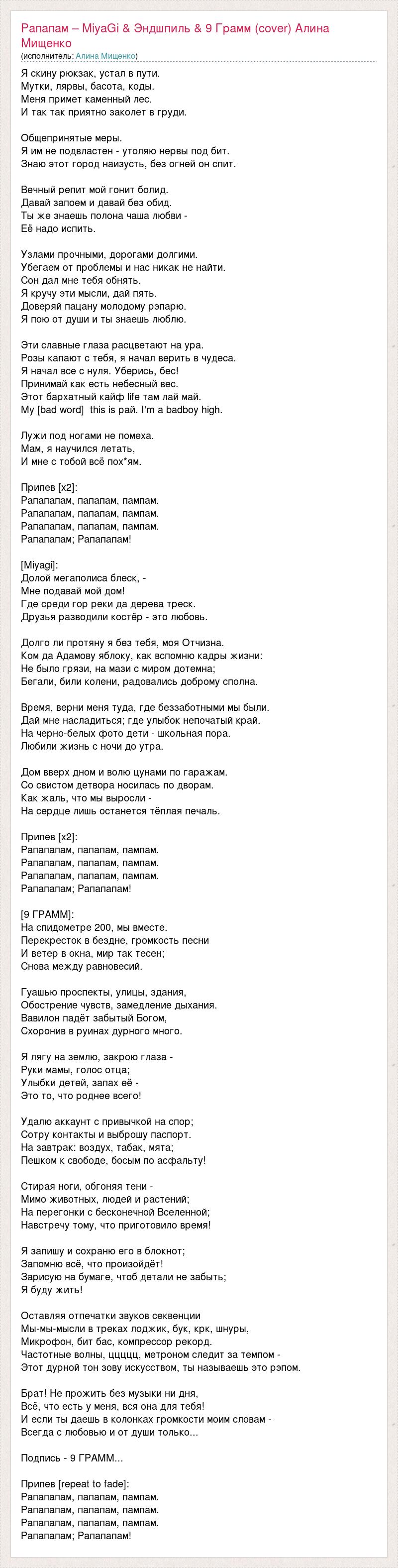 Я скину рюкзак, устал в пути. Мутки, лярвы, басота, коды. Меня примет каменный лес. И так так приятно заколет в груди. Общепринятые меры. Я им не подвластен - утоляю нервы под бит. Знаю этот город наизусть, без огней он спит. Вечный репит мой гонит болид. Давай запоем и давай без обид. Ты же знаешь полона чаша любви - Её надо испить. Узлами прочными, дорогами долгими. Убегаем от проблемы и нас никак не найти. Сон дал мне тебя обнять. Я кручу эти мысли, дай пять. Доверяй пацану молодому рэпарю. Я пою от души и ты знаешь люблю. Эти славные глаза расцветают на ура. Розы капают с тебя, я начал верить в чудеса. Я начал все с нуля. Уберись, бес! Принимай как есть небесный вес. Этот бархатный кайф life там лай май. My [bad word] this is рай. I'm a badboy high. Лужи под ногами не помеха. Мам, я научился летать, И мне с тобой всё пох*ям. Припев [x2]: Рапапапам, папапам, пампам. Рапапапам, папапам, пампам. Рапапапам, папапам, пампам. Рапапапам; Рапапапам! [Miyagi]: Долой мегаполиса блеск, - Мне подавай мой дом! Где среди гор реки да дерева треск. Друзья разводили костёр - это любовь. Долго ли протяну я без тебя, моя Отчизна. Ком да Адамову яблоку, как вспомню кадры жизни: Не было грязи, на мази с миром дотемна; Бегали, били колени, радовались доброму сполна. Время, верни меня туда, где беззаботными мы были. Дай мне насладиться; где улыбок непочатый край. На черно-белых фото дети - школьная пора. Любили жизнь с ночи до утра. Дом вверх дном и волю цунами по гаражам. Со свистом детвора носилась по дворам. Как жаль, что мы выросли - На сердце лишь останется тёплая печаль. Припев [x2]: Рапапапам, папапам, пампам. Рапапапам, папапам, пампам. Рапапапам, папапам, пампам. Рапапапам; Рапапапам! [9 ГРАММ]: На спидометре 200, мы вместе. Перекресток в бездне, громкость песни И ветер в окна, мир так тесен; Снова между равновесий. Гуашью проспекты, улицы, здания, Обострение чувств, замедление дыхания. Вавилон падёт забытый Богом, Схоронив в руинах дурного много. Я лягу на землю, закрою глаза - Руки мамы, голос отца; Улыбки детей, запах её - Это то, что роднее всего! Удалю аккаунт с привычкой на спор; Сотру контакты и выброшу паспорт. На завтрак: воздух, табак, мята; Пешком к свободе, босым по асфальту! Стирая ноги, обгоняя тени - Мимо животных, людей и растений; На перегонки с бесконечной Вселенной; Навстречу тому, что приготовило время! Я запишу и сохраню его в блокнот; Запомню всё, что произойдёт! Зарисую на бумаге, чтоб детали не забыть; Я буду жить! Оставляя отпечатки звуков секвенции Мы-мы-мысли в треках лоджик, бук, крк, шнуры, Микрофон, бит бас, компрессор рекорд. Частотные волны, ццццц, метроном следит за темпом - Этот дурной тон зову искусством, ты называешь это рэпом. Брат! Не прожить без музыки ни дня, Всё, что есть у меня, вся она для тебя! И если ты даешь в колонках громкости моим словам - Всегда с любовью и от души только... Подпись - 9 ГРАММ... Припев [repeat to fade]: Рапапапам, папапам, пампам. Рапапапам, папапам, пампам. Рапапапам, папапам, пампам. Рапапапам; Рапапапам!