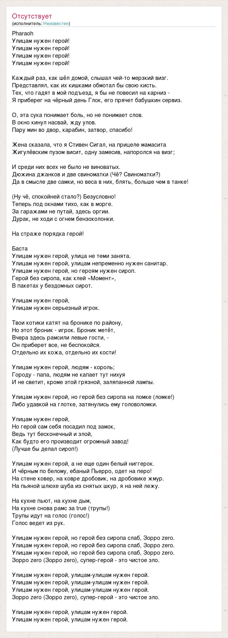 Pharaoh Улицам нужен герой! Улицам нужен герой! Улицам нужен герой! Улицам нужен герой! Каждый раз, как шёл домой, слышал чей-то мерзкий визг. Представлял, как их кишками обмотал бы свою кисть. Тех, что гадят в мой подъезд, я бы не повесил на карниз - Я приберег на чёрный день Глок, его прячет бабушкин сервиз. О, эта сука понимает боль, но не понимает слов. В окно кинул насвай, жду улов. Пару мин во двор, карабин, затвор, спасибо! Жена сказала, что я Стивен Сигал, на прицеле мамасита Жигулёвским пузом висит, одну замесив, напоролся на визг; И среди них всех не было не виноватых. Дюжина джанков и две свиноматки (Чё? Свиноматки?) Да в смысле две самки, но веса в них, блять, больше чем в танке! (Ну чё, спокойней стало?) Безусловно! Теперь под окнами тихо, как в морге. За гаражами не путай, здесь оргии. Дурак, не ходи с огнем бензоколонки. На страже порядка герой! Баста Улицам нужен герой, улица не теми занята. Улицам нужен герой, улицам непременно нужен санитар. Улицам нужен герой, но героям нужен сироп. Герой без сиропа, как клей «Момент», В пакетах у бездомных сирот. Улицам нужен герой, Улицам нужен серьезный игрок. Твои котики катят на бронике по району, Но этот броник - игрок. Броник метёт, Вчера здесь рамсили левые гости, - Он приберет все, не беспокойся. Отдельно их кожа, отдельно их кости! Улицам нужен герой, людям - король; Городу - папа, людям не капает тут нихуя И не светит, кроме этой грязной, заляпанной лампы. Улицам нужен герой, но герой без сиропа на ломке (ломке!) Либо удавкой на глотке, затянулись ему головоломки. Улицам нужен герой, Но герой сам себя посадил под замок, Ведь тут бесконечный и злой, Как будто его производит огромный завод! (Лучше бы делал сироп!) Улицам нужен герой, а не еще один белый ниггерок. И чёрным по белому, ебаный Пьерро, одет на перо! На стене ковер, на ковре дробовик, на дробовике жмур. На пьяной шлюхе шуба из снятых шкур, я на ней лежу. На кухне пьют, на кухне дым, На кухне снова рамс за true (трупы!) Трупы идут на голос (голос!) Голос ведет из рук. Улицам нужен герой, но герой без сиропа слаб, Зорро zero. Улицам нужен герой, но герой без сиропа слаб, Зорро zero. Улицам нужен герой, но герой без сиропа слаб, Зорро zero. Зорро zero (Зорро zero), супер-герой - это чистое зло. Улицам нужен герой, улицам-улицам нужен герой. Улицам нужен герой, улицам-улицам нужен герой. Улицам нужен герой, улицам-улицам нужен герой. Зорро zero (Зорро zero), супер-герой - это чистое зло. Улицам нужен герой, улицам нужен герой. Улицам нужен герой, улицам нужен герой.