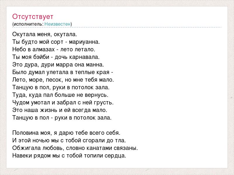 Окутала меня, окутала. Ты будто мой сорт - мариуанна. Небо в алмазах - лето летало. Ты моя бэйби - дочь карнавала. Это дура, дури марра она манна. Было думал улетала в теплые края - Лето, море, песок, но мне тебя мало. Танцую в пол, руки в потолок зала. Туда, куда пал больше не вернусь. Чудом умотал и забрал с ней грусть. Это наша жизнь и ей всегда мало. Танцую в пол - руки в потолок зала. Половина моя, я дарю тебе всего себя. И этой ночью мы с тобой сгорали до тла. Обжигала любовь, словно канатами связаны. Навеки рядом мы с тобой топили сердца.