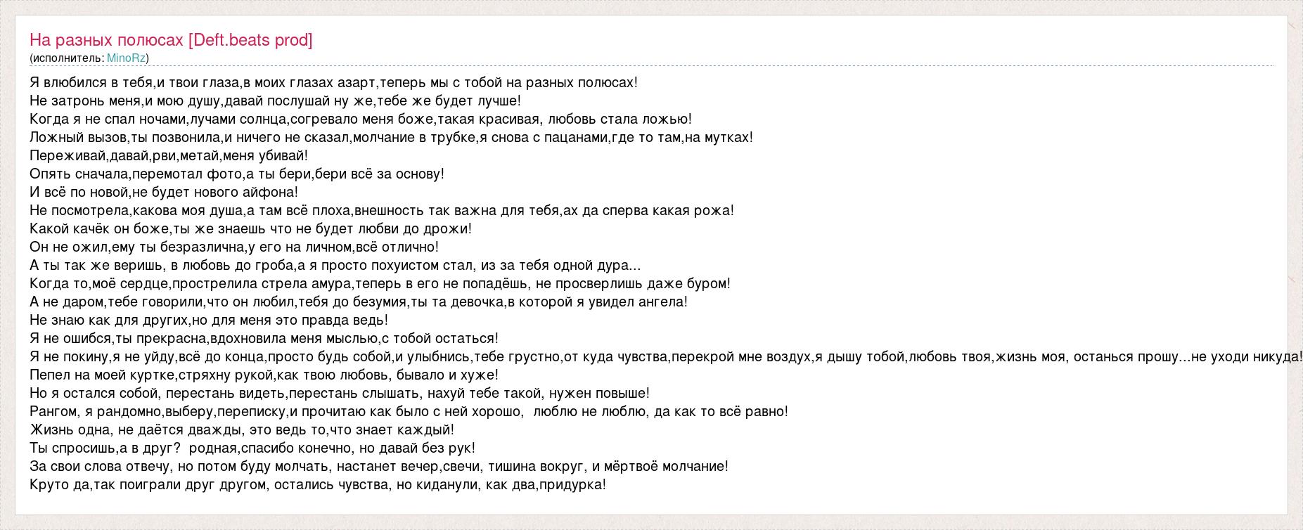 Я влюбился в тебя,и твои глаза,в моих глазах азарт,теперь мы с тобой на разных полюсах! Не затронь меня,и мою душу,давай послушай ну же,тебе же будет лучше! Когда я не спал ночами,лучами солнца,согревало меня боже,такая красивая, любовь стала ложью! Ложный вызов,ты позвонила,и ничего не сказал,молчание в трубке,я снова с пацанами,где то там,на мутках! Переживай,давай,рви,метай,меня убивай! Опять сначала,перемотал фото,а ты бери,бери всё за основу! И всё по новой,не будет нового айфона! Не посмотрела,какова моя душа,а там всё плоха,внешность так важна для тебя,ах да сперва какая рожа! Какой качёк он боже,ты же знаешь что не будет любви до дрожи! Он не ожил,ему ты безразлична,у его на личном,всё отлично! А ты так же веришь, в любовь до гроба,а я просто похуистом стал, из за тебя одной дура... Когда то,моё сердце,прострелила стрела амура,теперь в его не попадёшь, не просверлишь даже буром! А не даром,тебе говорили,что он любил,тебя до безумия,ты та девочка,в которой я увидел ангела! Не знаю как для других,но для меня это правда ведь! Я не ошибся,ты прекрасна,вдохновила меня мыслью,с тобой остаться! Я не покину,я не уйду,всё до конца,просто будь собой,и улыбнись,тебе грустно,от куда чувства,перекрой мне воздух,я дышу тобой,любовь твоя,жизнь моя, останься прошу...не уходи никуда! Пепел на моей куртке,стряхну рукой,как твою любовь, бывало и хуже! Но я остался собой, перестань видеть,перестань слышать, нахуй тебе такой, нужен повыше! Рангом, я рандомно,выберу,переписку,и прочитаю как было с ней хорошо, люблю не люблю, да как то всё равно! Жизнь одна, не даётся дважды, это ведь то,что знает каждый! Ты спросишь,а в друг? родная,спасибо конечно, но давай без рук! За свои слова отвечу, но потом буду молчать, настанет вечер,свечи, тишина вокруг, и мёртвоё молчание! Круто да,так поиграли друг другом, остались чувства, но киданули, как два,придурка!