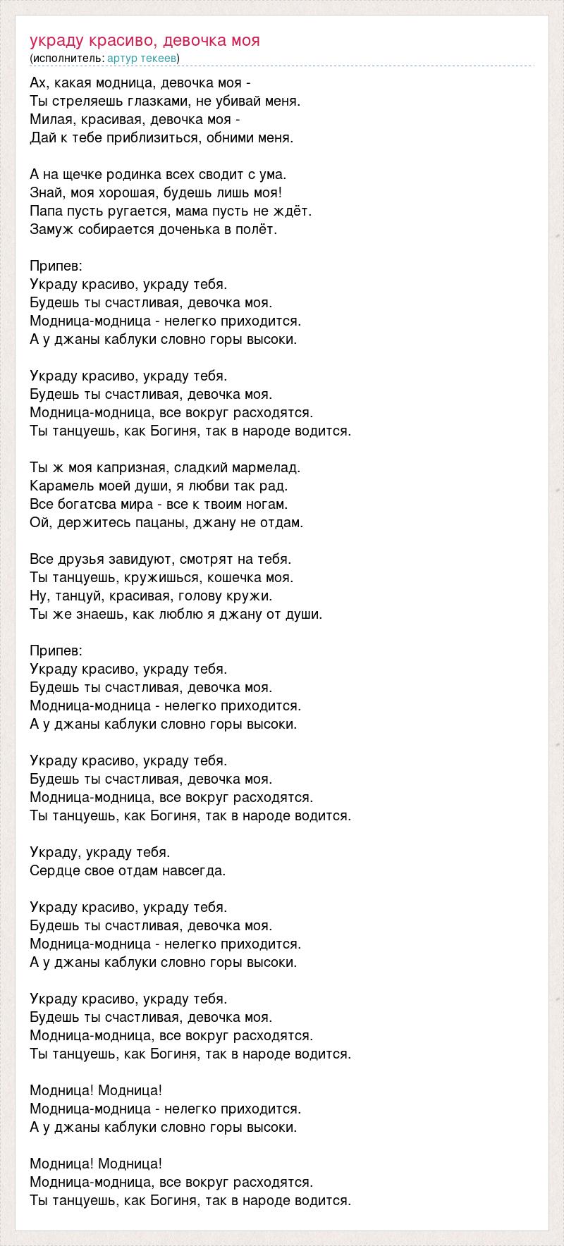 Ах, какая модница, девочка моя - Ты стреляешь глазками, не убивай меня. Милая, красивая, девочка моя - Дай к тебе приблизиться, обними меня. А на щечке родинка всех сводит с ума. Знай, моя хорошая, будешь лишь моя! Папа пусть ругается, мама пусть не ждёт. Замуж собирается доченька в полёт. Припев: Украду красиво, украду тебя. Будешь ты счастливая, девочка моя. Модница-модница - нелегко приходится. А у джаны каблуки словно горы высоки. Украду красиво, украду тебя. Будешь ты счастливая, девочка моя. Модница-модница, все вокруг расходятся. Ты танцуешь, как Богиня, так в народе водится. Ты ж моя капризная, сладкий мармелад. Карамель моей души, я любви так рад. Все богатсва мира - все к твоим ногам. Ой, держитесь пацаны, джану не отдам. Все друзья завидуют, смотрят на тебя. Ты танцуешь, кружишься, кошечка моя. Ну, танцуй, красивая, голову кружи. Ты же знаешь, как люблю я джану от души. Припев: Украду красиво, украду тебя. Будешь ты счастливая, девочка моя. Модница-модница - нелегко приходится. А у джаны каблуки словно горы высоки. Украду красиво, украду тебя. Будешь ты счастливая, девочка моя. Модница-модница, все вокруг расходятся. Ты танцуешь, как Богиня, так в народе водится. Украду, украду тебя. Сердце свое отдам навсегда. Украду красиво, украду тебя. Будешь ты счастливая, девочка моя. Модница-модница - нелегко приходится. А у джаны каблуки словно горы высоки. Украду красиво, украду тебя. Будешь ты счастливая, девочка моя. Модница-модница, все вокруг расходятся. Ты танцуешь, как Богиня, так в народе водится. Модница! Модница! Модница-модница - нелегко приходится. А у джаны каблуки словно горы высоки. Модница! Модница! Модница-модница, все вокруг расходятся. Ты танцуешь, как Богиня, так в народе водится.