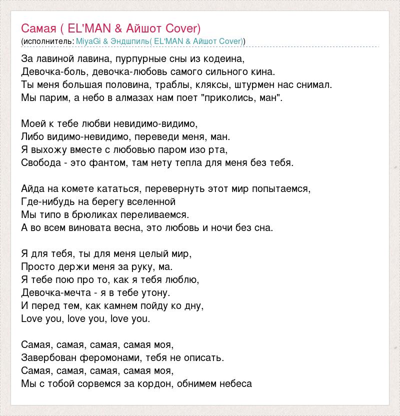 За лавиной лавина, пурпурные сны из кодеина, Девочка-боль, девочка-любовь самого сильного кина. Ты меня большая половина, траблы, кляксы, штурмен нас снимал. Мы парим, а небо в алмазах нам поет "приколись, ман". Моей к тебе любви невидимо-видимо, Либо видимо-невидимо, переведи меня, ман. Я выхожу вместе с любовью паром изо рта, Свобода - это фантом, там нету тепла для меня без тебя. Айда на комете кататься, перевернуть этот мир попытаемся, Где-нибудь на берегу вселенной Мы типо в брюликах переливаемся. А во всем виновата весна, это любовь и ночи без сна. Я для тебя, ты для меня целый мир, Просто держи меня за руку, ма. Я тебе пою про то, как я тебя люблю, Девочка-мечта - я в тебе утону. И перед тем, как камнем пойду ко дну, Love you, love you, love you. Самая, самая, самая, самая моя, Завербован феромонами, тебя не описать. Самая, самая, самая, самая моя, Мы с тобой сорвемся за кордон, обнимем небеса