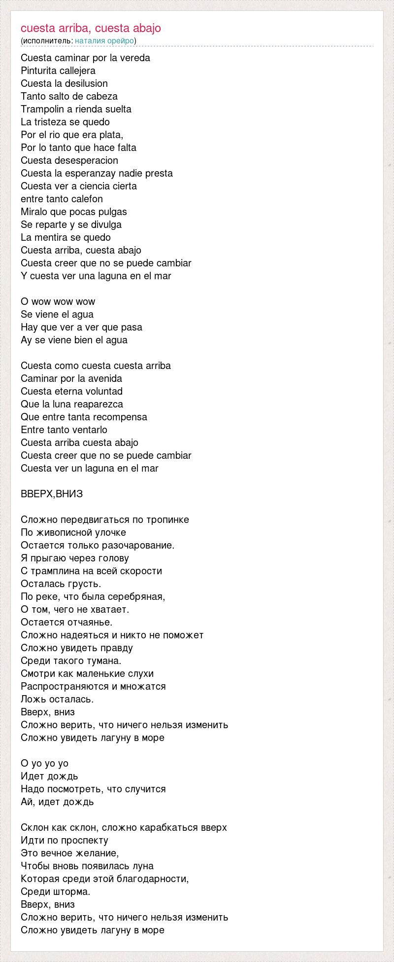 Cuesta caminar por la vereda Pinturita callejera Cuesta la desilusion Tanto salto de cabeza Trampolin a rienda suelta La tristeza se quedo Por el rio que era plata, Por lo tanto que hace falta Cuesta desesperacion Cuesta la esperanzay nadie presta Cuesta ver a ciencia cierta entre tanto calefon Miralo que pocas pulgas Se reparte y se divulga La mentira se quedo Cuesta arriba, cuesta abajo Cuesta creer que no se puede cambiar Y cuesta ver una laguna en el mar O wow wow wow Se viene el agua Hay que ver a ver que pasa Ay se viene bien el agua Cuesta como cuesta cuesta arriba Caminar por la avenida Cuesta eterna voluntad Que la luna reaparezca Que entre tanta recompensa Entre tanto ventarlo Cuesta arriba cuesta abajo Cuesta creer que no se puede cambiar Cuesta ver un laguna en el mar ВВЕРХ,ВНИЗ Сложно передвигаться по тропинке По живописной улочке Остается только разочарование. Я прыгаю через голову С трамплина на всей скорости Осталась грусть. По реке, что была серебряная, О том, чего не хватает. Остается отчаянье. Сложно надеяться и никто не поможет Сложно увидеть правду Среди такого тумана. Смотри как маленькие слухи Распространяются и множатся Ложь осталась. Вверх, вниз Сложно верить, что ничего нельзя изменить Сложно увидеть лагуну в море О уо уо уо Идет дождь Надо посмотреть, что случится Ай, идет дождь Склон как склон, сложно карабкаться вверх Идти по проспекту Это вечное желание, Чтобы вновь появилась луна Которая среди этой благодарности, Среди шторма. Вверх, вниз Сложно верить, что ничего нельзя изменить Сложно увидеть лагуну в море