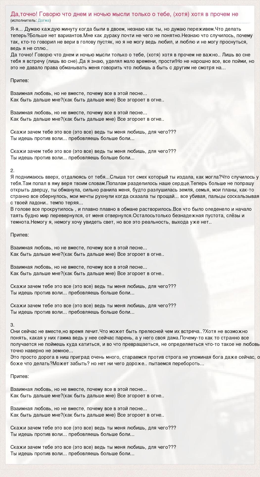 Я-я... Думаю каждую минуту когда были в двоем, незнаю как ты, но думаю переживем.Что делать теперь?Больше нет вариантов.Мне как дураку почти не чего не понятно.Незнаю что случилось, почему так, кто-то говорил не вери в голову пустяк, но я не могу ведь любил, и люблю и не могу проснуться, ведь я не сплю.. Да точно! Говорю что днем и ночью мысли только о тебе, (хотя) хотя в прочем не важно.. Лишь во сне тебя я встречу (лишь во сне).Да я знаю, уделял мало времени, прости!Но не нарошно все, все пойми, но это не давало права обманывать меня говорить что любишь а быть с другим не смотря на... Припев: Взаимная любовь, но не вместе, почему все в этой песне... Как быть дальше мне?(как быть дальше мне) Все згороет в огне.. Взаимная любовь, но не вместе, почему все в этой песне... Как быть дальше мне?(как быть дальше мне) Все згороет в огне.. Скажи зачем тебе это все (это все) ведь ты меня любишь, для чего??? Ты идешь против воли... пребовляешь больше боли... Скажи зачем тебе это все (это все) ведь ты меня любишь, для чего??? Ты идешь против воли... пребовляешь больше боли... 2. Я поднимаюсь вверх, отдалюясь от тебя...Слыша тот смех который ты издала, как могла?Что случилось у тебя.Там попал в яму веря твоим словам.Попалам разделилось наше сердце.Теперь больше не попрашу открыть дверцу, ты обманула, сильно ранила меня, будто разлушилась земля, семья, мои планы, как-то странно все обернулось, мои мечты рухнули когда сказала ты прощай... все убивая, пальцы соскальзывая с твоей ладони.. темпо теряя... В голове все прокрутилось , и плавно плавно в обмане растворилось.Все что было оледенело и начало таять будно мир перевернулся, от меня отвернулся.Осталосьтолько безнадежная пустота, слёзы и темнота.Немогу я, немогу хочу увидеть свет, но все это реальность, выхода уже нет.. Припев: Взаимная любовь, но не вместе, почему все в этой песне... Как быть дальше мне?(как быть дальше мне) Все згороет в огне.. Взаимная любовь, но не вместе, почему все в этой песне... Как быть дальше мне?(как быть дальше мне) Все згороет в огне.. Скажи зачем тебе это все (это все) ведь ты меня любишь, для чего??? Ты идешь против воли... пребовляешь больше боли... Скажи зачем тебе это все (это все) ведь ты меня любишь, для чего??? Ты идешь против воли... пребовляешь больше боли... 3. Они сейчас не вместе,но время лечит.Что может быть прелесней чем их встреча..?Хотя не возможно понять, какая у них гамма ведь у нее сейчас парень, а у него своя дама.Почему-то как то странно все получается не поймешь куда катиться, и во что превращаеться, не определяеться что-то такое не любовь точно наверно не земное... Это просто дорога в ниш приград очень много, стараемся против строга не упоминая бога даже сейчас, о боже что делать?Может забыть? но нет ни чего дороже.. пытаемся перебороть... Припев: Взаимная любовь, но не вместе, почему все в этой песне... Как быть дальше мне?(как быть дальше мне) Все згороет в огне.. Взаимная любовь, но не вместе, почему все в этой песне... Как быть дальше мне?(как быть дальше мне) Все згороет в огне.. Скажи зачем тебе это все (это все) ведь ты меня любишь, для чего??? Ты идешь против воли... пребовляешь больше боли... Скажи зачем тебе это все (это все) ведь ты меня любишь, для чего??? Ты идешь против воли... пребовляешь больше боли...