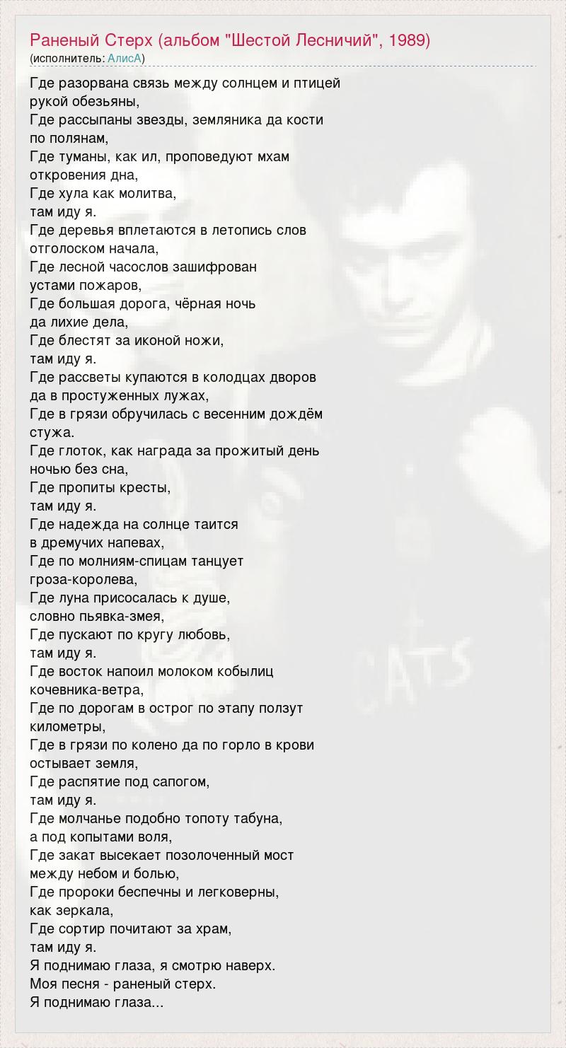 Где разорвана связь между солнцем и птицей рукой обезьяны, Где рассыпаны звезды, земляника да кости по полянам, Где туманы, как ил, проповедуют мхам откровения дна, Где хула как молитва, там иду я. Где деревья вплетаются в летопись слов отголоском начала, Где лесной часослов зашифрован устами пожаров, Где большая дорога, чёрная ночь да лихие дела, Где блестят за иконой ножи, там иду я. Где рассветы купаются в колодцах дворов да в простуженных лужах, Где в грязи обручилась с весенним дождём стужа. Где глоток, как награда за прожитый день ночью без сна, Где пропиты кресты, там иду я. Где надежда на солнце таится в дремучих напевах, Где по молниям-спицам танцует гроза-королева, Где луна присосалась к душе, словно пьявка-змея, Где пускают по кругу любовь, там иду я. Где восток напоил молоком кобылиц кочевника-ветра, Где по дорогам в острог по этапу ползут километры, Где в грязи по колено да по горло в крови остывает земля, Где распятие под сапогом, там иду я. Где молчанье подобно топоту табуна, а под копытами воля, Где закат высекает позолоченный мост между небом и болью, Где пророки беспечны и легковерны, как зеркала, Где сортир почитают за храм, там иду я. Я поднимаю глаза, я смотрю наверх. Моя песня - раненый стерх. Я поднимаю глаза...