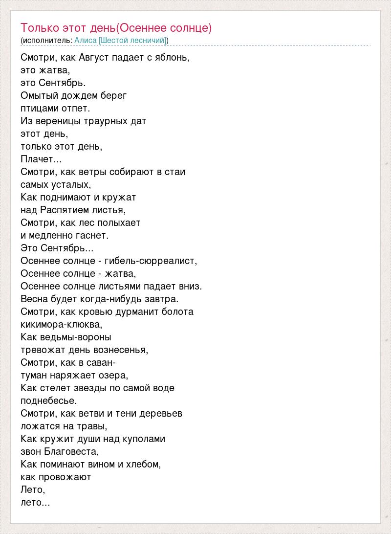Смотри, как Август падает с яблонь, это жатва, это Сентябрь. Омытый дождем берег птицами отпет. Из вереницы траурных дат этот день, только этот день, Плачет... Смотри, как ветры собирают в стаи самых усталых, Как поднимают и кружат над Распятием листья, Смотри, как лес полыхает и медленно гаснет. Это Сентябрь... Осеннее солнце - гибель-сюрреалист, Осеннее солнце - жатва, Осеннее солнце листьями падает вниз. Весна будет когда-нибудь завтра. Смотри, как кровью дурманит болота кикимора-клюква, Как ведьмы-вороны тревожат день вознесенья, Смотри, как в саван- туман наряжает озера, Как стелет звезды по самой воде поднебесье. Смотри, как ветви и тени деревьев ложатся на травы, Как кружит души над куполами звон Благовеста, Как поминают вином и хлебом, как провожают Лето, лето...
