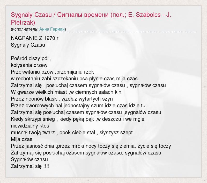 NAGRANIE Z 1970 r Sygnaly Czasu Pośród ciszy pól , kołysania drzew Przekwitaniu bzów ,przemijaniu rzek w rechotaniu żabi szczekaniu psa płynie czas mija czas. Zatrzymaj się , posłuchaj czasem sygnałów czasu , sygnałów czasu W gwarze wielkich miast ,w ciemnych salach kin Przez neonów blask , wzdłuż wytartych szyn Przez dworcowych hal jednostajny szum idzie czas idzie tu Zatrzymaj się posłuchaj czasem sygnałów czasu ,sygnałów czasu Kiedy skrzypi śnieg , kiedy pęką pąk ,w deszczu i we mgle niewidzialny ktoś musnął twoją twarz , obok ciebie stał , słyszysz szept Mija czas Przez jasność dnia ,przez mroki nocy toczy się ziemia, życie się toczy Zatrzymaj się posłuchaj czasem sygnałów czasu, sygnałów czasu Sygnałów czasu Zatrzymaj się !!!!