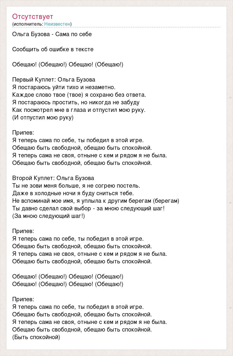 Ольга Бузова - Сама по себе Сообщить об ошибке в тексте Обещаю! (Обещаю!) Обещаю! (Обещаю!) Первый Куплет: Ольга Бузова Я постараюсь уйти тихо и незаметно. Каждое слово твое (твое) я сохраню без ответа. Я постараюсь простить, но никогда не забуду Как посмотрел мне в глаза и отпустил мою руку. (И отпустил мою руку) Припев: Я теперь сама по себе, ты победил в этой игре. Обещаю быть свободной, обещаю быть спокойной. Я теперь сама не своя, отныне с кем и рядом я не была. Обещаю быть свободной, обещаю быть спокойной. Второй Куплет: Ольга Бузова Ты не зови меня больше, я не согрею постель. Даже в холодные ночи я буду сниться тебе. Не вспоминай мое имя, я уплыла к другим берегам (берегам) Ты давно сделал свой выбор - за мною следующий шаг! (За мною следующий шаг!) Припев: Я теперь сама по себе, ты победил в этой игре. Обещаю быть свободной, обещаю быть спокойной. Я теперь сама не своя, отныне с кем и рядом я не была. Обещаю быть свободной, обещаю быть спокойной. Обещаю! (Обещаю!) Обещаю! (Обещаю!) Обещаю! (Обещаю!) Обещаю! (Обещаю!) Припев: Я теперь сама по себе, ты победил в этой игре. Обещаю быть свободной, обещаю быть спокойной. Я теперь сама не своя, отныне с кем и рядом я не была. Обещаю быть свободной, обещаю быть спокойной. (Быть спокойной)