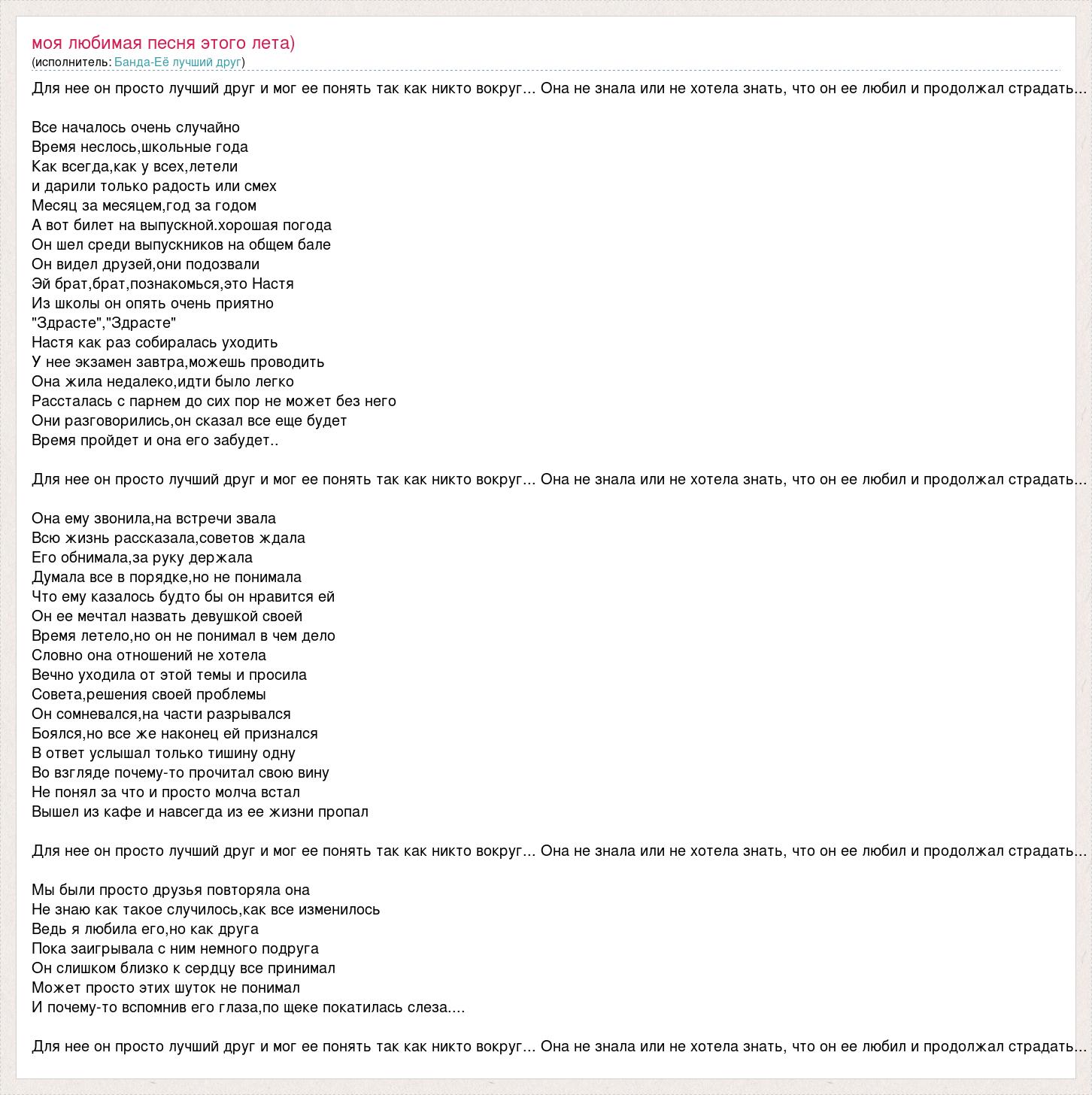Для нее он просто лучший друг и мог ее понять так как никто вокруг... Она не знала или не хотела знать, что он ее любил и продолжал страдать... Все началось очень случайно Время неслось,школьные года Как всегда,как у всех,летели и дарили только радость или смех Месяц за месяцем,год за годом А вот билет на выпускной.хорошая погода Он шел среди выпускников на общем бале Он видел друзей,они подозвали Эй брат,брат,познакомься,это Настя Из школы он опять очень приятно "Здрасте","Здрасте" Настя как раз собиралась уходить У нее экзамен завтра,можешь проводить Она жила недалеко,идти было легко Рассталась с парнем до сих пор не может без него Они разговорились,он сказал все еще будет Время пройдет и она его забудет.. Для нее он просто лучший друг и мог ее понять так как никто вокруг... Она не знала или не хотела знать, что он ее любил и продолжал страдать... Она ему звонила,на встречи звала Всю жизнь рассказала,советов ждала Его обнимала,за руку держала Думала все в порядке,но не понимала Что ему казалось будто бы он нравится ей Он ее мечтал назвать девушкой своей Время летело,но он не понимал в чем дело Словно она отношений не хотела Вечно уходила от этой темы и просила Совета,решения своей проблемы Он сомневался,на части разрывался Боялся,но все же наконец ей признался В ответ услышал только тишину одну Во взгляде почему-то прочитал свою вину Не понял за что и просто молча встал Вышел из кафе и навсегда из ее жизни пропал Для нее он просто лучший друг и мог ее понять так как никто вокруг... Она не знала или не хотела знать, что он ее любил и продолжал страдать... Мы были просто друзья повторяла она Не знаю как такое случилось,как все изменилось Ведь я любила его,но как друга Пока заигрывала с ним немного подруга Он слишком близко к сердцу все принимал Может просто этих шуток не понимал И почему-то вспомнив его глаза,по щеке покатилась слеза.... Для нее он просто лучший друг и мог ее понять так как никто вокруг... Она не знала или не хотела знать, что он ее любил и продолжал страдать...
