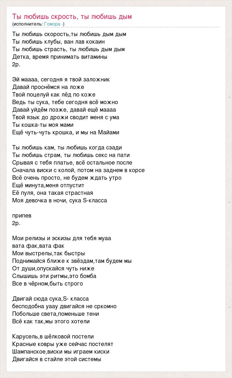 Ты любишь скорость,ты любишь дым дым Ты любишь клубы, ван лав кокаин Ты любишь страсть, ты любишь дым дым Детка, время принимать витамины 2р. Эй маааа, сегодня я твой заложник Давай проснёмся на ложе Твой поцелуй как лёд по коже Ведь ты сука, тебе сегодня всё можно Давай уйдём позже, давай ещё маааа Твой язык до дрожи сводит меня с ума Ты кошка-ты моя мами Ещё чуть-чуть крошка, и мы на Майами Ты любишь кам, ты любишь когда сзади Ты любишь страм, ты любишь секс на пати Срывая с тебя платье, всё остальное после Сначала виски с колой, потом на заднем в корсе Всё очень просто, не будем ждать утро Ещё минута,меня отпустит Её пуля, она такая страстная Моя девочка в ночи, сука S-класса припев 2р. Мои релизы и эскизы для тебя муаа вата фак,вата фак Мои выстрелы,так быстры Поднимайся ближе к звёздам,там будем мы От души,опускайся чуть ниже Слышишь эти ритмы,это бомба Все в чёрном,быть строго Двигай сюда сука,S- класса бесподобна уаау двигайся не сркомно Побольше света,поменьше тени Всё как так,мы этого хотели Карусель,в шёлковой постели Красные ковры уже сейчас постелят Шампанское,виски мы играем киски Двигайся в стайле этой системы
