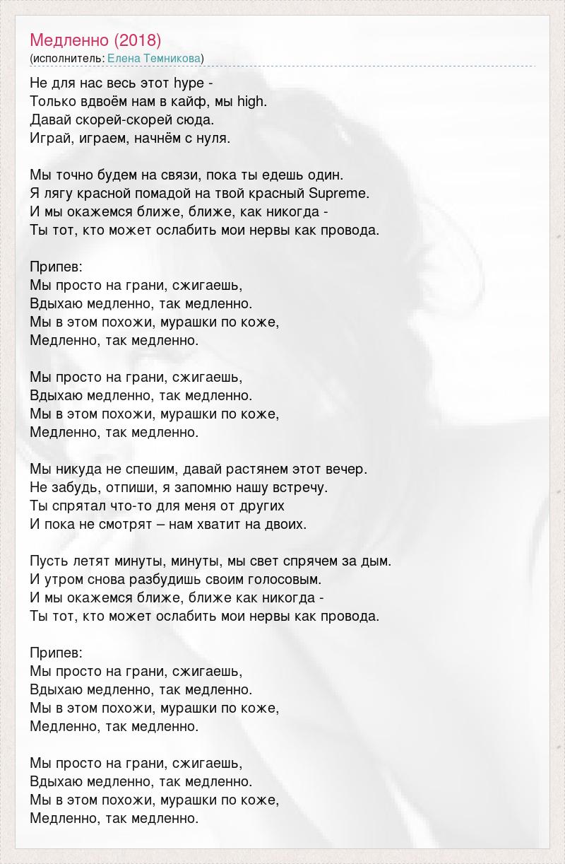 Не для нас весь этот hype - Только вдвоём нам в кайф, мы high. Давай скорей-скорей сюда. Играй, играем, начнём с нуля. Мы точно будем на связи, пока ты едешь один. Я лягу красной помадой на твой красный Supreme. И мы окажемся ближе, ближе, как никогда - Ты тот, кто может ослабить мои нервы как провода. Припев: Мы просто на грани, сжигаешь, Вдыхаю медленно, так медленно. Мы в этом похожи, мурашки по коже, Медленно, так медленно. Мы просто на грани, сжигаешь, Вдыхаю медленно, так медленно. Мы в этом похожи, мурашки по коже, Медленно, так медленно. Мы никуда не спешим, давай растянем этот вечер. Не забудь, отпиши, я запомню нашу встречу. Ты спрятал что-то для меня от других И пока не смотрят – нам хватит на двоих. Пусть летят минуты, минуты, мы свет спрячем за дым. И утром снова разбудишь своим голосовым. И мы окажемся ближе, ближе как никогда - Ты тот, кто может ослабить мои нервы как провода. Припев: Мы просто на грани, сжигаешь, Вдыхаю медленно, так медленно. Мы в этом похожи, мурашки по коже, Медленно, так медленно. Мы просто на грани, сжигаешь, Вдыхаю медленно, так медленно. Мы в этом похожи, мурашки по коже, Медленно, так медленно.
