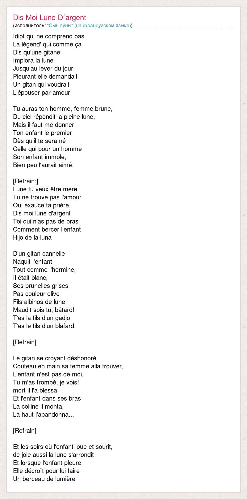 Idiot qui ne comprend pas La légend' qui comme ça Dis qu'une gitane Implora la lune Jusqu'au lever du jour Pleurant elle demandait Un gitan qui voudrait L'épouser par amour Tu auras ton homme, femme brune, Du ciel répondit la pleine lune, Mais il faut me donner Ton enfant le premier Dès qu'il te sera né Celle qui pour un homme Son enfant immole, Bien peu l'aurait aimé. [Refrain:] Lune tu veux être mère Tu ne trouve pas l'amour Qui exauce ta prière Dis moi lune d'argent Toi qui n'as pas de bras Comment bercer l'enfant Hijo de la luna D'un gitan cannelle Naquit l'enfant Tout comme l'hermine, Il était blanc, Ses prunelles grises Pas couleur olive Fils albinos de lune Maudit sois tu, bâtard! T'es la fils d'un gadjo T'es le fils d'un blafard. [Refrain] Le gitan se croyant déshonoré Couteau en main sa femme alla trouver, L'enfant n'est pas de moi, Tu m'as trompé, je vois! mort il l'a blessa Et l'enfant dans ses bras La colline il monta, Là haut l'abandonna... [Refrain] Et les soirs où l'enfant joue et sourit, de joie aussi la lune s'arrondit Et lorsque l'enfant pleure Elle décroît pour lui faire Un berceau de lumière