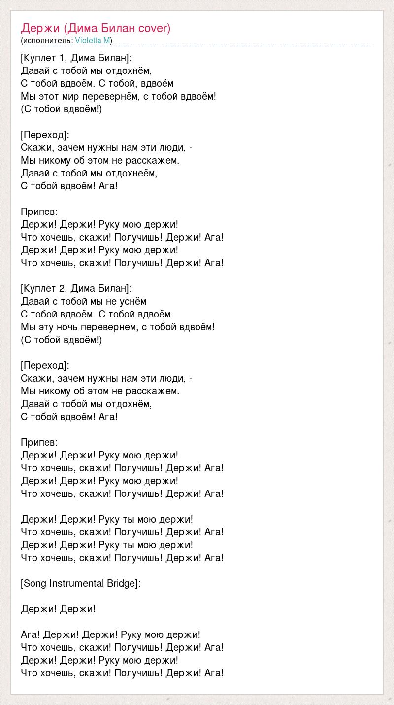 [Куплет 1, Дима Билан]: Давай с тобой мы отдохнём, С тобой вдвоём. С тобой, вдвоём Мы этот мир перевернём, с тобой вдвоём! (С тобой вдвоём!) [Переход]: Скажи, зачем нужны нам эти люди, - Мы никому об этом не расскажем. Давай с тобой мы отдохнеём, С тобой вдвоём! Ага! Припев: Держи! Держи! Руку мою держи! Что хочешь, скажи! Получишь! Держи! Ага! Держи! Держи! Руку мою держи! Что хочешь, скажи! Получишь! Держи! Ага! [Куплет 2, Дима Билан]: Давай с тобой мы не уснём С тобой вдвоём. С тобой вдвоём Мы эту ночь перевернем, с тобой вдвоём! (С тобой вдвоём!) [Переход]: Скажи, зачем нужны нам эти люди, - Мы никому об этом не расскажем. Давай с тобой мы отдохнём, С тобой вдвоём! Ага! Припев: Держи! Держи! Руку мою держи! Что хочешь, скажи! Получишь! Держи! Ага! Держи! Держи! Руку мою держи! Что хочешь, скажи! Получишь! Держи! Ага! Держи! Держи! Руку ты мою держи! Что хочешь, скажи! Получишь! Держи! Ага! Держи! Держи! Руку ты мою держи! Что хочешь, скажи! Получишь! Держи! Ага! [Song Instrumental Bridge]: Держи! Держи! Ага! Держи! Держи! Руку мою держи! Что хочешь, скажи! Получишь! Держи! Ага! Держи! Держи! Руку мою держи! Что хочешь, скажи! Получишь! Держи! Ага!