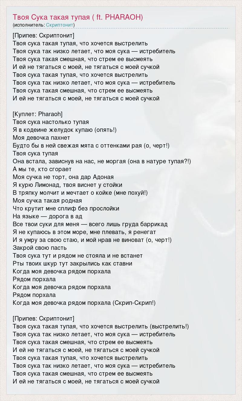 [Припев: Скриптонит] Твоя сука такая тупая, что хочется выстрелить Твоя сука так низко летает, что моя сука — истребитель Твоя сука такая смешная, что стрем ее высмеять И ей не тягаться с моей, не тягаться с моей сучкой Твоя сука такая тупая, что хочется выстрелить Твоя сука так низко летает, что моя сука — истребитель Твоя сука такая смешная, что стрем ее высмеять И ей не тягаться с моей, не тягаться с моей сучкой [Куплет: Pharaoh] Твоя сука настолько тупая Я в кодеине желудок купаю (опять!) Моя девочка пахнет Будто бы в ней свежая мята с оттенками рая (о, черт!) Твоя сука тупая Она встала, зависнув на нас, не моргая (она в натуре тупая?!) А мы те, кто сгорает Моя сучка не торт, она дар Адоная Я курю Лимонад, твоя виснет у стойки В тряпку молчит и мечтает о койке (мне похуй!) Моя сучка такая родная Что крутит мне сплиф без прослойки На языке — дорога в ад Все твои суки для меня — всего лишь груда баррикад Я не купаюсь в этом море, мне плевать, я ренегат И я умру за свою стаю, и мой нрав не виноват (о, черт!) Закрой свою пасть Твоя сука тут и рядом не стояла и не встанет Рты твоих шкур тут закрылись как ставни Когда моя девочка рядом порхала Рядом порхала Когда моя девочка рядом порхала Рядом порхала Когда моя девочка рядом порхала (Скрип-Скрип!) [Припев: Скриптонит] Твоя сука такая тупая, что хочется выстрелить (выстрелить!) Твоя сука так низко летает, что моя сука — истребитель Твоя сука такая смешная, что стрем ее высмеять И ей не тягаться с моей, не тягаться с моей сучкой Твоя сука такая тупая, что хочется выстрелить Твоя сука так низко летает, что моя сука — истребитель Твоя сука такая смешная, что стрем ее высмеять И ей не тягаться с моей, не тягаться с моей сучкой