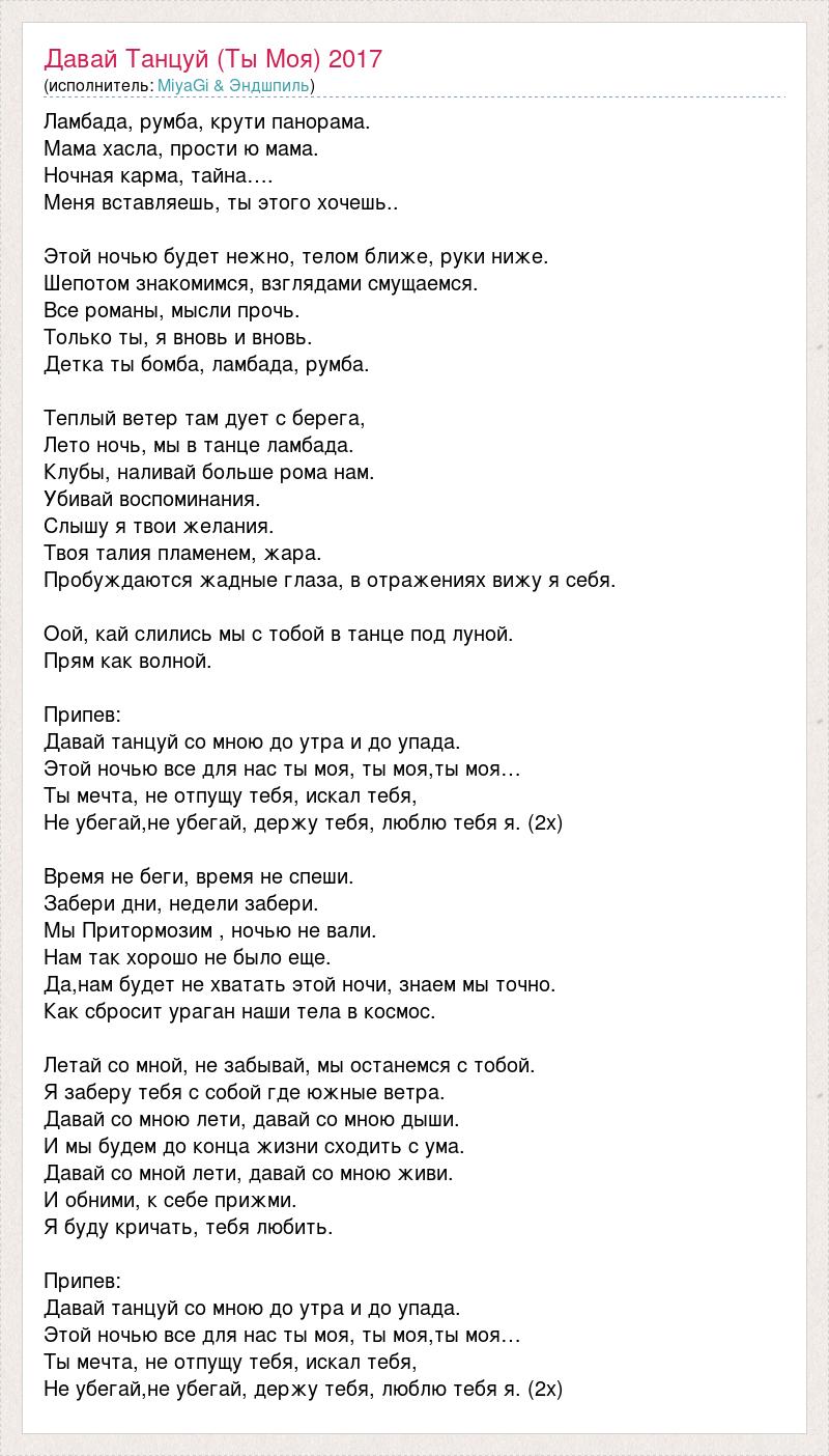 Ламбада, румба, крути панорама. Мама хасла, прости ю мама. Ночная карма, тайна…. Меня вставляешь, ты этого хочешь.. Этой ночью будет нежно, телом ближе, руки ниже. Шепотом знакомимся, взглядами смущаемся. Все романы, мысли прочь. Только ты, я вновь и вновь. Детка ты бомба, ламбада, румба. Теплый ветер там дует с берега, Лето ночь, мы в танце ламбада. Клубы, наливай больше рома нам. Убивай воспоминания. Слышу я твои желания. Твоя талия пламенем, жара. Пробуждаются жадные глаза, в отражениях вижу я себя. Оой, кай слились мы с тобой в танце под луной. Прям как волной. Припев: Давай танцуй со мною до утра и до упада. Этой ночью все для нас ты моя, ты моя,ты моя… Ты мечта, не отпущу тебя, искал тебя, Не убегай,не убегай, держу тебя, люблю тебя я. (2х) Время не беги, время не спеши. Забери дни, недели забери. Мы Притормозим , ночью не вали. Нам так хорошо не было еще. Да,нам будет не хватать этой ночи, знаем мы точно. Как сбросит ураган наши тела в космос. Летай со мной, не забывай, мы останемся с тобой. Я заберу тебя с собой где южные ветра. Давай со мною лети, давай со мною дыши. И мы будем до конца жизни сходить с ума. Давай со мной лети, давай со мною живи. И обними, к себе прижми. Я буду кричать, тебя любить. Припев: Давай танцуй со мною до утра и до упада. Этой ночью все для нас ты моя, ты моя,ты моя… Ты мечта, не отпущу тебя, искал тебя, Не убегай,не убегай, держу тебя, люблю тебя я. (2х)