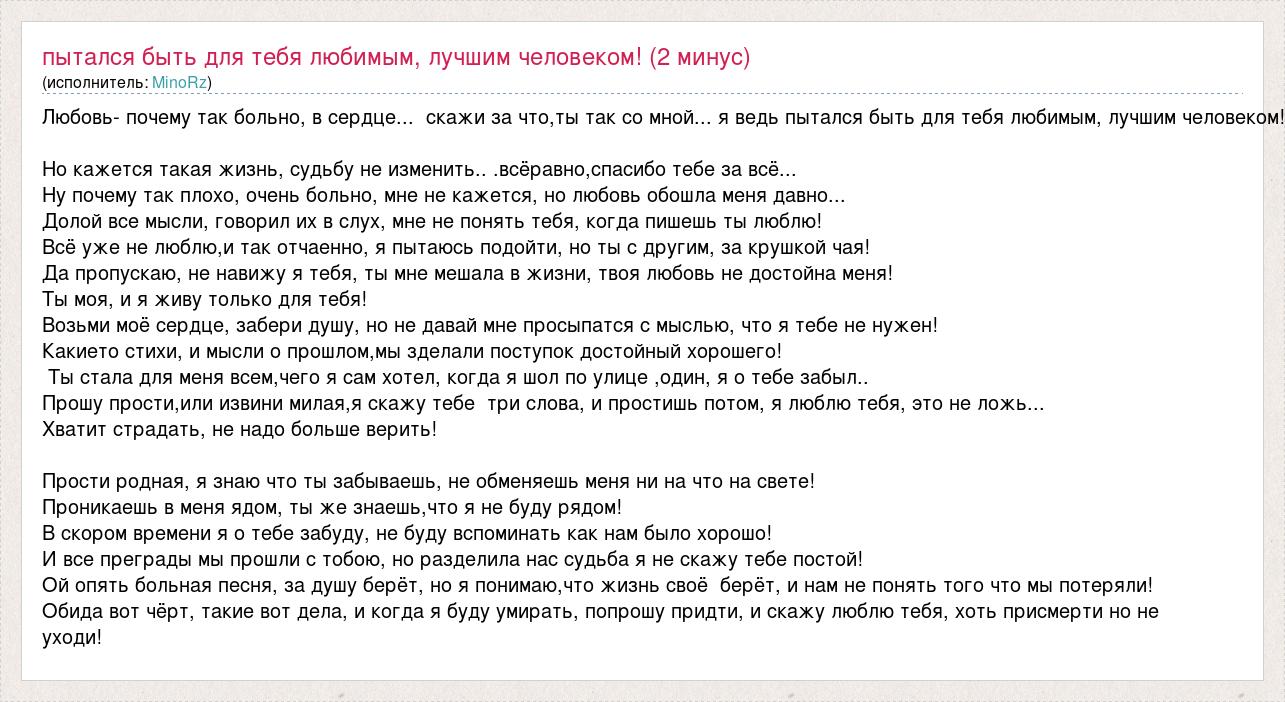 Любовь- почему так больно, в сердце... скажи за что,ты так со мной... я ведь пытался быть для тебя любимым, лучшим человеком! Но кажется такая жизнь, судьбу не изменить.. .всёравно,спасибо тебе за всё... Ну почему так плохо, очень больно, мне не кажется, но любовь обошла меня давно... Долой все мысли, говорил их в слух, мне не понять тебя, когда пишешь ты люблю! Всё уже не люблю,и так отчаенно, я пытаюсь подойти, но ты с другим, за крушкой чая! Да пропускаю, не навижу я тебя, ты мне мешала в жизни, твоя любовь не достойна меня! Ты моя, и я живу только для тебя! Возьми моё сердце, забери душу, но не давай мне просыпатся с мыслью, что я тебе не нужен! Какието стихи, и мысли о прошлом,мы зделали поступок достойный хорошего! Ты стала для меня всем,чего я сам хотел, когда я шол по улице ,один, я о тебе забыл.. Прошу прости,или извини милая,я скажу тебе три слова, и простишь потом, я люблю тебя, это не ложь... Хватит страдать, не надо больше верить! Прости родная, я знаю что ты забываешь, не обменяешь меня ни на что на свете! Проникаешь в меня ядом, ты же знаешь,что я не буду рядом! В скором времени я о тебе забуду, не буду вспоминать как нам было хорошо! И все преграды мы прошли с тобою, но разделила нас судьба я не скажу тебе постой! Ой опять больная песня, за душу берёт, но я понимаю,что жизнь своё берёт, и нам не понять того что мы потеряли! Обида вот чёрт, такие вот дела, и когда я буду умирать, попрошу придти, и скажу люблю тебя, хоть присмерти но не уходи!
