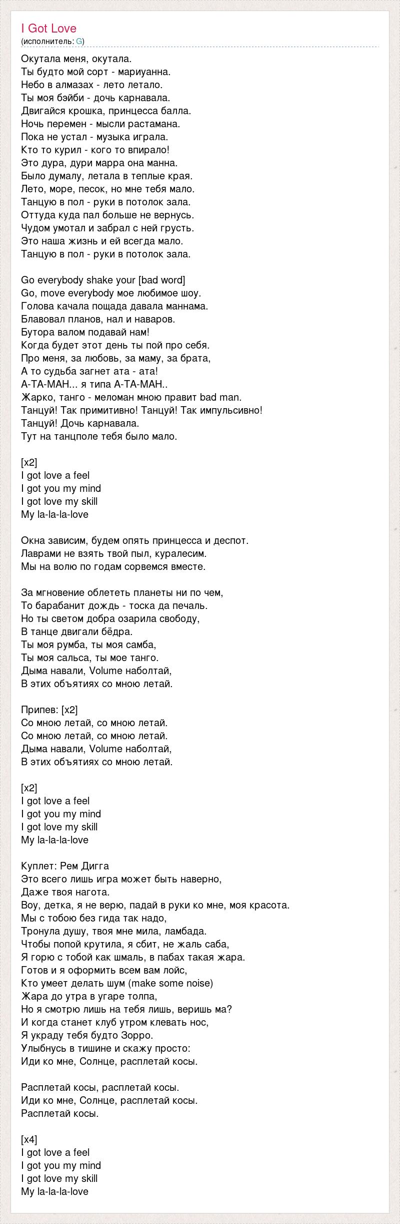 Окутала меня, окутала. Ты будто мой сорт - мариуанна. Небо в алмазах - лето летало. Ты моя бэйби - дочь карнавала. Двигайся крошка, принцесса балла. Ночь перемен - мысли растамана. Пока не устал - музыка играла. Кто то курил - кого то впирало! Это дура, дури марра она манна. Было думалу, летала в теплые края. Лето, море, песок, но мне тебя мало. Танцую в пол - руки в потолок зала. Оттуда куда пал больше не вернусь. Чудом умотал и забрал с ней грусть. Это наша жизнь и ей всегда мало. Танцую в пол - руки в потолок зала. Go everybody shake your [bad word] Go, move everybody мое любимое шоу. Голова качала пощада давала маннама. Блавовал планов, нал и наваров. Бутора валом подавай нам! Когда будет этот день ты пой про себя. Про меня, за любовь, за маму, за брата, А то судьба загнет ата - ата! А-ТА-МАН... я типа А-ТА-МАН.. Жарко, танго - меломан мною правит bad man. Танцуй! Так примитивно! Танцуй! Так импульсивно! Танцуй! Дочь карнавала. Тут на танцполе тебя было мало. [x2] I got love a feel I got you my mind I got love my skill My la-la-la-love Окна зависим, будем опять принцесса и деспот. Лаврами не взять твой пыл, куралесим. Мы на волю по годам сорвемся вместе. За мгновение облететь планеты ни по чем, То барабанит дождь - тоска да печаль. Но ты светом добра озарила свободу, В танце двигали бёдра. Ты моя румба, ты моя самба, Ты моя сальса, ты мое танго. Дыма навали, Volume наболтай, В этих объятиях со мною летай. Припев: [х2] Со мною летай, со мною летай. Со мною летай, со мною летай. Дыма навали, Volume наболтай, В этих объятиях со мною летай. [х2] I got love a feel I got you my mind I got love my skill My la-la-la-love Куплет: Рем Дигга Это всего лишь игра может быть наверно, Даже твоя нагота. Воу, детка, я не верю, падай в руки ко мне, моя красота. Мы с тобою без гида так надо, Тронула душу, твоя мне мила, ламбада. Чтобы попой крутила, я сбит, не жаль саба, Я горю с тобой как шмаль, в пабах такая жара. Готов и я оформить всем вам лойс, Кто умеет делать шум (make some noise) Жара до утра в угаре толпа, Но я смотрю лишь на тебя лишь, веришь ма? И когда станет клуб утром клевать нос, Я украду тебя будто Зорро. Улыбнусь в тишине и скажу просто: Иди ко мне, Солнце, расплетай косы. Расплетай косы, расплетай косы. Иди ко мне, Солнце, расплетай косы. Расплетай косы. [x4] I got love a feel I got you my mind I got love my skill My la-la-la-love