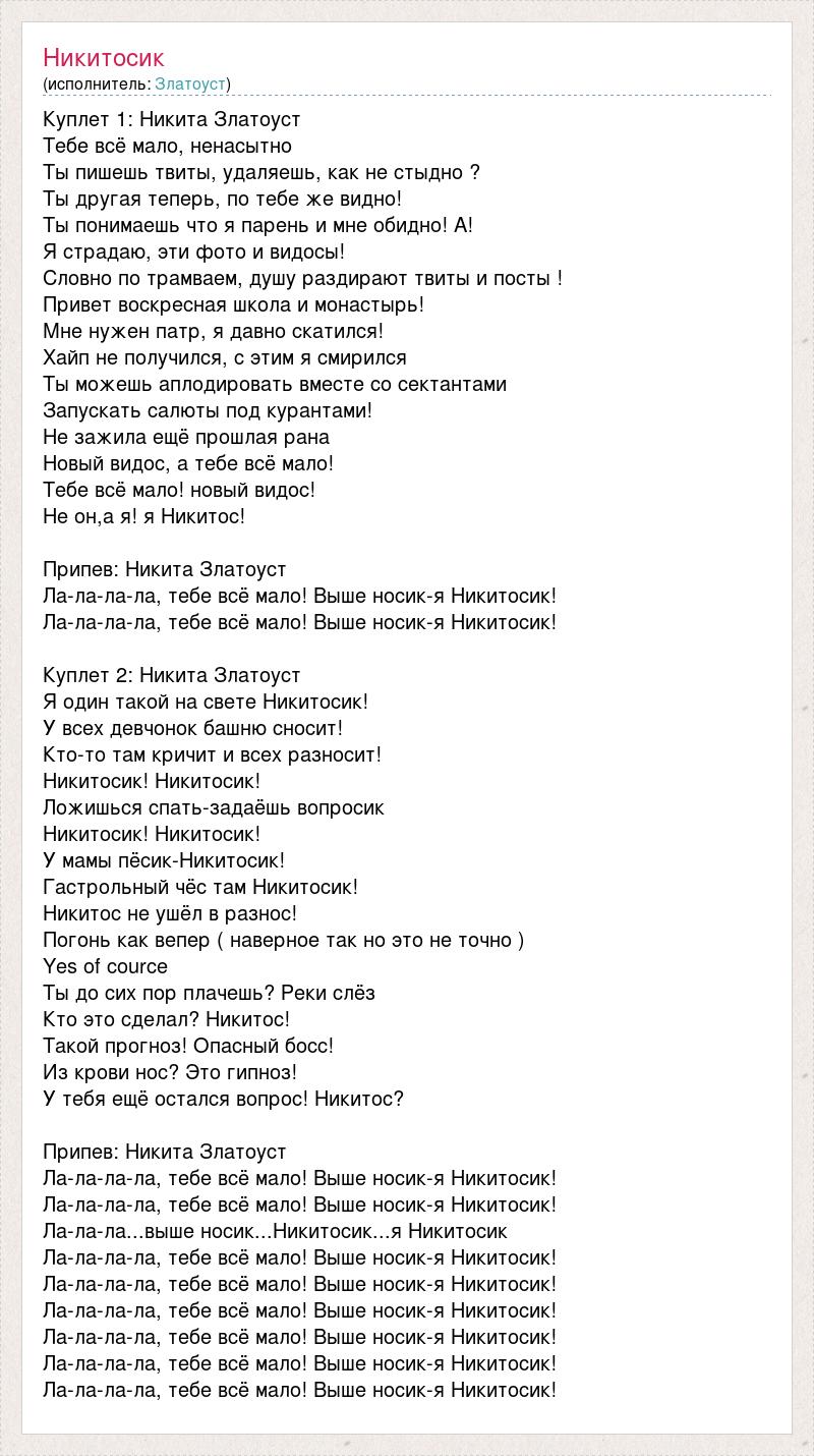 Куплет 1: Никита Златоуст Тебе всё мало, ненасытно Ты пишешь твиты, удаляешь, как не стыдно ? Ты другая теперь, по тебе же видно! Ты понимаешь что я парень и мне обидно! А! Я страдаю, эти фото и видосы! Словно по трамваем, душу раздирают твиты и посты ! Привет воскресная школа и монастырь! Мне нужен патр, я давно скатился! Хайп не получился, с этим я смирился Ты можешь аплодировать вместе со сектантами Запускать салюты под курантами! Не зажила ещё прошлая рана Новый видос, а тебе всё мало! Тебе всё мало! новый видос! Не он,а я! я Никитос! Припев: Никита Златоуст Ла-ла-ла-ла, тебе всё мало! Выше носик-я Никитосик! Ла-ла-ла-ла, тебе всё мало! Выше носик-я Никитосик! Куплет 2: Никита Златоуст Я один такой на свете Никитосик! У всех девчонок башню сносит! Кто-то там кричит и всех разносит! Никитосик! Никитосик! Ложишься спать-задаёшь вопросик Никитосик! Никитосик! У мамы пёсик-Никитосик! Гастрольный чёс там Никитосик! Никитос не ушёл в разнос! Погонь как вепер ( наверное так но это не точно ) Yes of cource Ты до сих пор плачешь? Реки слёз Кто это сделал? Никитос! Такой прогноз! Опасный босс! Из крови нос? Это гипноз! У тебя ещё остался вопрос! Никитос? Припев: Никита Златоуст Ла-ла-ла-ла, тебе всё мало! Выше носик-я Никитосик! Ла-ла-ла-ла, тебе всё мало! Выше носик-я Никитосик! Ла-ла-ла...выше носик...Никитосик...я Никитосик Ла-ла-ла-ла, тебе всё мало! Выше носик-я Никитосик! Ла-ла-ла-ла, тебе всё мало! Выше носик-я Никитосик! Ла-ла-ла-ла, тебе всё мало! Выше носик-я Никитосик! Ла-ла-ла-ла, тебе всё мало! Выше носик-я Никитосик! Ла-ла-ла-ла, тебе всё мало! Выше носик-я Никитосик! Ла-ла-ла-ла, тебе всё мало! Выше носик-я Никитосик!