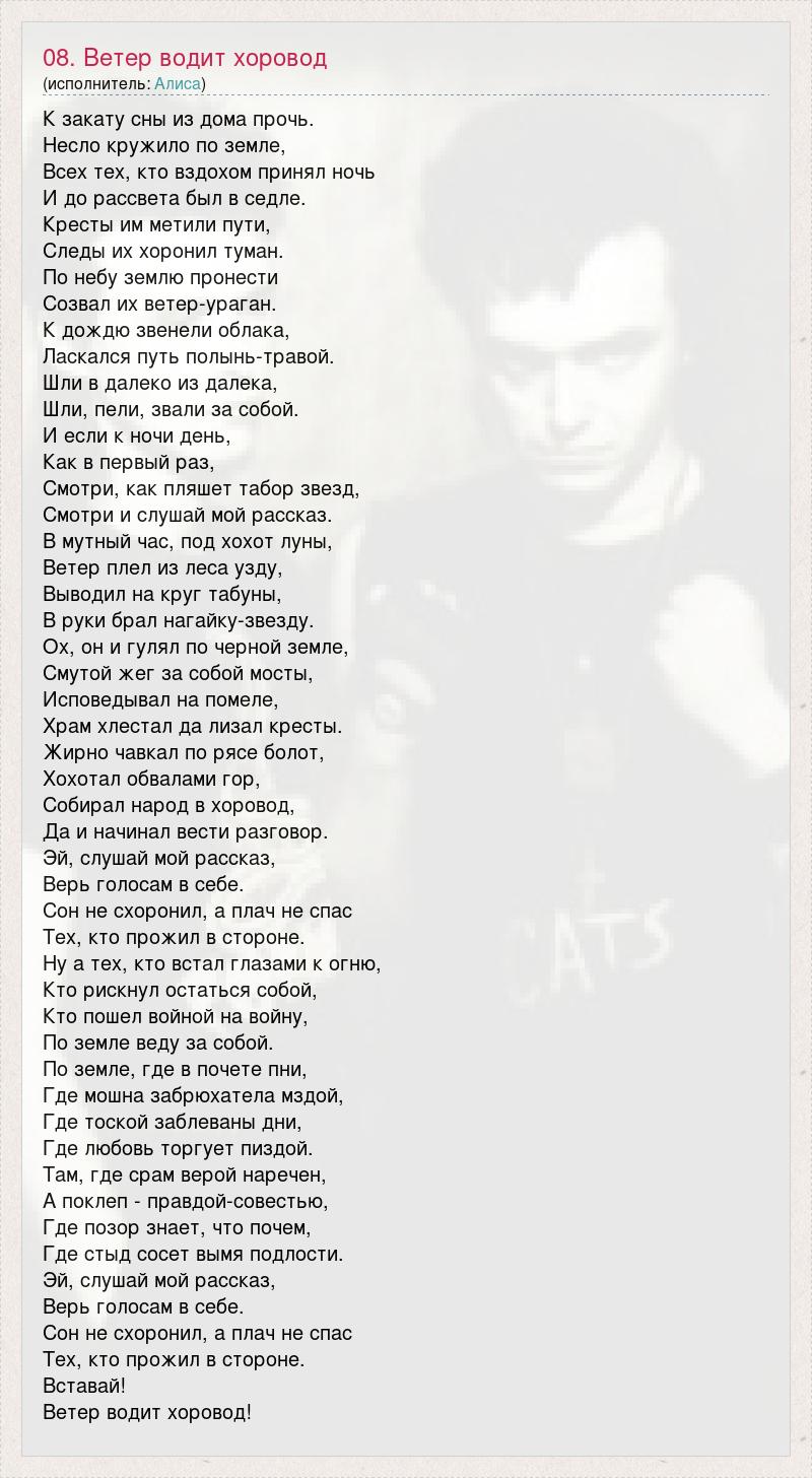 К закату сны из дома прочь. Несло кружило по земле, Всех тех, кто вздохом принял ночь И до рассвета был в седле. Кресты им метили пути, Следы их хоронил туман. По небу землю пронести Созвал их ветер-ураган. К дождю звенели облака, Ласкался путь полынь-травой. Шли в далеко из далека, Шли, пели, звали за собой. И если к ночи день, Как в первый раз, Смотри, как пляшет табор звезд, Смотри и слушай мой рассказ. В мутный час, под хохот луны, Ветер плел из леса узду, Выводил на круг табуны, В руки брал нагайку-звезду. Ох, он и гулял по черной земле, Смутой жег за собой мосты, Исповедывал на помеле, Храм хлестал да лизал кресты. Жирно чавкал по рясе болот, Хохотал обвалами гор, Собирал народ в хоровод, Да и начинал вести разговор. Эй, слушай мой рассказ, Верь голосам в себе. Сон не схоронил, а плач не спас Тех, кто прожил в стороне. Ну а тех, кто встал глазами к огню, Кто рискнул остаться собой, Кто пошел войной на войну, По земле веду за собой. По земле, где в почете пни, Где мошна забрюхатела мздой, Где тоской заблеваны дни, Где любовь торгует пиздой. Там, где срам верой наречен, А поклеп - правдой-совестью, Где позор знает, что почем, Где стыд сосет вымя подлости. Эй, слушай мой рассказ, Верь голосам в себе. Сон не схоронил, а плач не спас Тех, кто прожил в стороне. Вставай! Ветер водит хоровод!