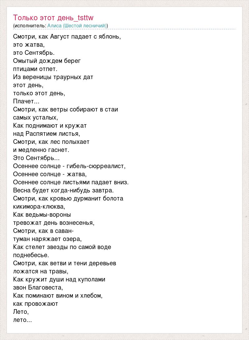 Смотри, как Август падает с яблонь, это жатва, это Сентябрь. Омытый дождем берег птицами отпет. Из вереницы траурных дат этот день, только этот день, Плачет... Смотри, как ветры собирают в стаи самых усталых, Как поднимают и кружат над Распятием листья, Смотри, как лес полыхает и медленно гаснет. Это Сентябрь... Осеннее солнце - гибель-сюрреалист, Осеннее солнце - жатва, Осеннее солнце листьями падает вниз. Весна будет когда-нибудь завтра. Смотри, как кровью дурманит болота кикимора-клюква, Как ведьмы-вороны тревожат день вознесенья, Смотри, как в саван- туман наряжает озера, Как стелет звезды по самой воде поднебесье. Смотри, как ветви и тени деревьев ложатся на травы, Как кружит души над куполами звон Благовеста, Как поминают вином и хлебом, как провожают Лето, лето...