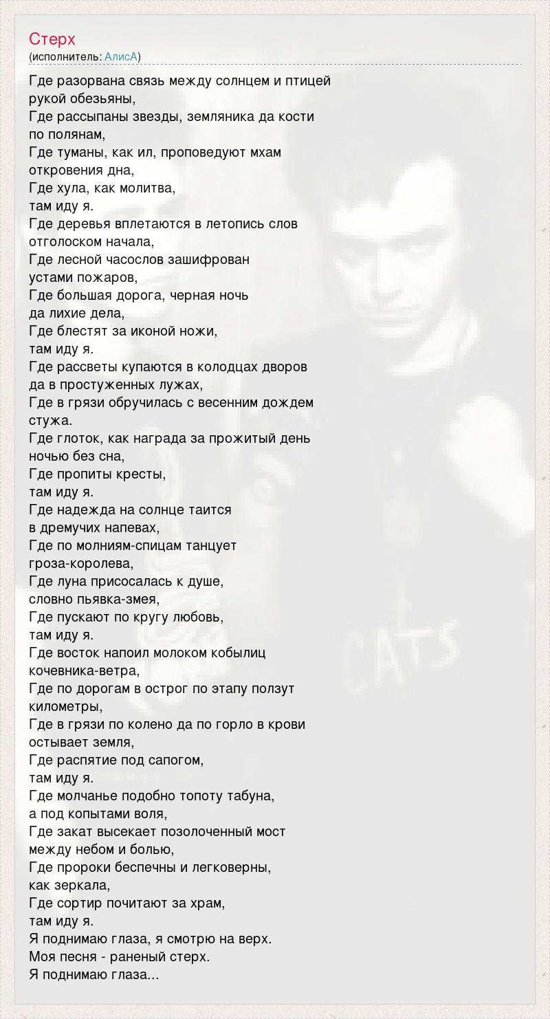 Где разорвана связь между солнцем и птицей рукой обезьяны, Где рассыпаны звезды, земляника да кости по полянам, Где туманы, как ил, проповедуют мхам откровения дна, Где хула, как молитва, там иду я. Где деревья вплетаются в летопись слов отголоском начала, Где лесной часослов зашифрован устами пожаров, Где большая дорога, черная ночь да лихие дела, Где блестят за иконой ножи, там иду я. Где рассветы купаются в колодцах дворов да в простуженных лужах, Где в грязи обручилась с весенним дождем стужа. Где глоток, как награда за прожитый день ночью без сна, Где пропиты кресты, там иду я. Где надежда на солнце таится в дремучих напевах, Где по молниям-спицам танцует гроза-королева, Где луна присосалась к душе, словно пьявка-змея, Где пускают по кругу любовь, там иду я. Где восток напоил молоком кобылиц кочевника-ветра, Где по дорогам в острог по этапу ползут километры, Где в грязи по колено да по горло в крови остывает земля, Где распятие под сапогом, там иду я. Где молчанье подобно топоту табуна, а под копытами воля, Где закат высекает позолоченный мост между небом и болью, Где пророки беспечны и легковерны, как зеркала, Где сортир почитают за храм, там иду я. Я поднимаю глаза, я смотрю на верх. Моя песня - раненый стерх. Я поднимаю глаза...