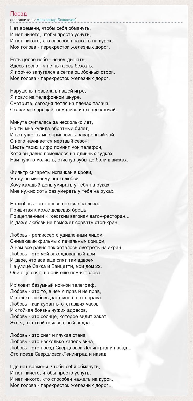 Нет времени, чтобы себя обмануть, И нет ничего, чтобы просто уснуть, И нет никого, кто способен нажать на курок. Моя голова - перекресток железных дорог. Есть целое небо - нечем дышать, Здесь тесно - я не пытаюсь бежать, Я прочно запутался в сетке ошибочных строк. Моя голова - перекресток железных дорог. Нарушены правила в нашей игре, Я повис на телефонном шнуре. Смотрите, сегодня петля на плечах палача! Скажи мне прощай, помолись и скорее кончай. Минута считалась за несколько лет, Но ты мне купила обратный билет, И вот уже ты мне приносишь заваренный чай. С него начинается мертвый сезон: Шесть твоих цифр помнит мой телефон, Хотя он давно помешался на длинных гудках. Нам нужно молчать, стиснув зубы до боли в висках. Фильтр сигареты испачкан в крови, Я еду по минному полю любви, Хочу каждый день умирать у тебя на руках. Мне нужно хоть раз умереть у тебя на руках. Но любовь - это слово похоже на ложь, Пришитая к коже дешевая брошь, Прицепленный к жестким вагонам вагон-ресторан... И даже любовь не поможет сорвать стоп-кран. Любовь - режиссер с удивленным лицом, Снимающий фильмы с печальным концом, А нам все равно так хотелось смотреть на экран. Любовь - это мой заколдованный дом И двое, что все еще спят там вдвоем На улице Сакка и Ванцетти, мой дом 22. Они еще спят, но они еще помнят слова. Их ловит безумный ночной телеграф, Любовь - это то, в чем я прав и не прав, И только любовь дает мне на это права. Любовь - как куранты отставших часов И стойкая боязнь чужих адресов, Любовь - это солнце, которое видит закат, Это я, это твой неизвестный солдат. Любовь - это снег и глухая стена, Любовь - это несколько капель вина, Любовь - это поезд Свердловск-Ленинград и назад... Это поезд Свердловск-Ленинград и назад, Где нет времени, чтобы себя обмануть, И нет ничего, чтобы просто уснуть, И нет никого, кто способен нажать на курок. Моя голова - перекресток железных дорог...