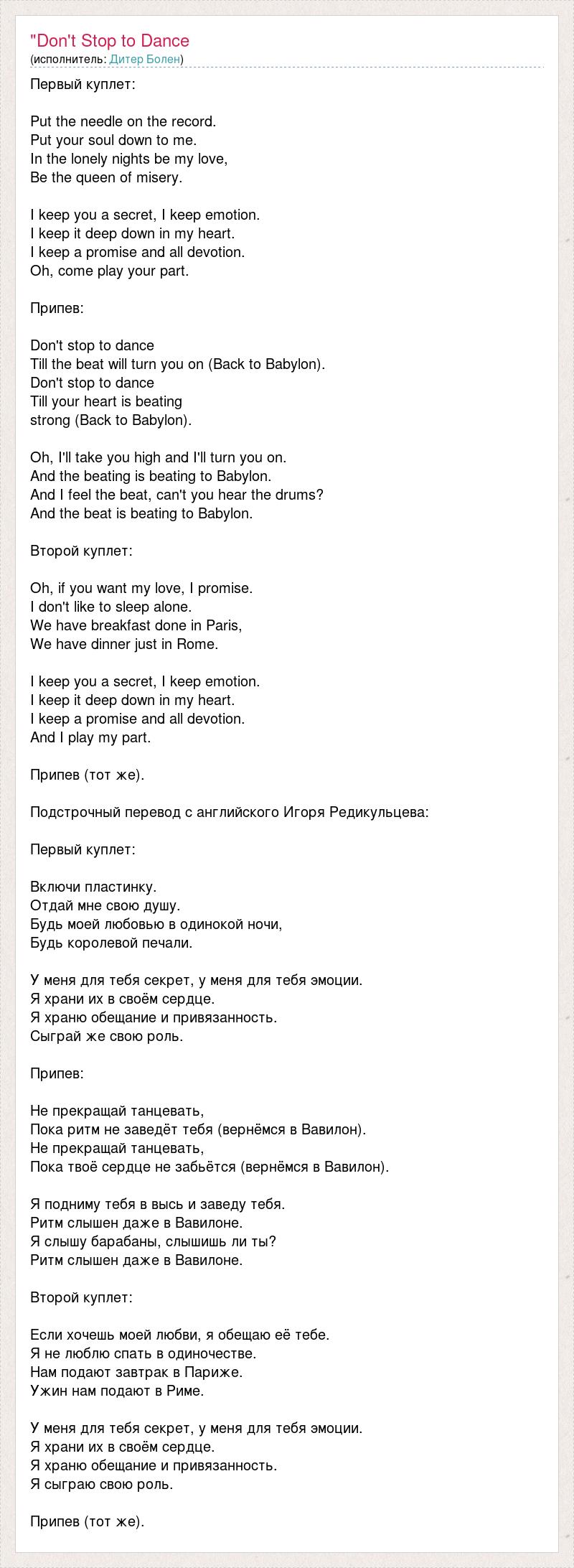 Первый куплет: Put the needle on the record. Put your soul down to me. In the lonely nights be my love, Be the queen of misery. I keep you a secret, I keep emotion. I keep it deep down in my heart. I keep a promise and all devotion. Oh, come play your part. Припев: Don't stop to dance Till the beat will turn you on (Back to Babylon). Don't stop to dance Till your heart is beating strong (Back to Babylon). Oh, I'll take you high and I'll turn you on. And the beating is beating to Babylon. And I feel the beat, can't you hear the drums? And the beat is beating to Babylon. Второй куплет: Oh, if you want my love, I promise. I don't like to sleep alone. We have breakfast done in Paris, We have dinner just in Rome. I keep you a secret, I keep emotion. I keep it deep down in my heart. I keep a promise and all devotion. And I play my part. Припев (тот же). Подстрочный перевод с английского Игоря Редикульцева: Первый куплет: Включи пластинку. Отдай мне свою душу. Будь моей любовью в одинокой ночи, Будь королевой печали. У меня для тебя секрет, у меня для тебя эмоции. Я храни их в своём сердце. Я храню обещание и привязанность. Сыграй же свою роль. Припев: Не прекращай танцевать, Пока ритм не заведёт тебя (вернёмся в Вавилон). Не прекращай танцевать, Пока твоё сердце не забьётся (вернёмся в Вавилон). Я подниму тебя в высь и заведу тебя. Ритм слышен даже в Вавилоне. Я слышу барабаны, слышишь ли ты? Ритм слышен даже в Вавилоне. Второй куплет: Если хочешь моей любви, я обещаю её тебе. Я не люблю спать в одиночестве. Нам подают завтрак в Париже. Ужин нам подают в Риме. У меня для тебя секрет, у меня для тебя эмоции. Я храни их в своём сердце. Я храню обещание и привязанность. Я сыграю свою роль. Припев (тот же).