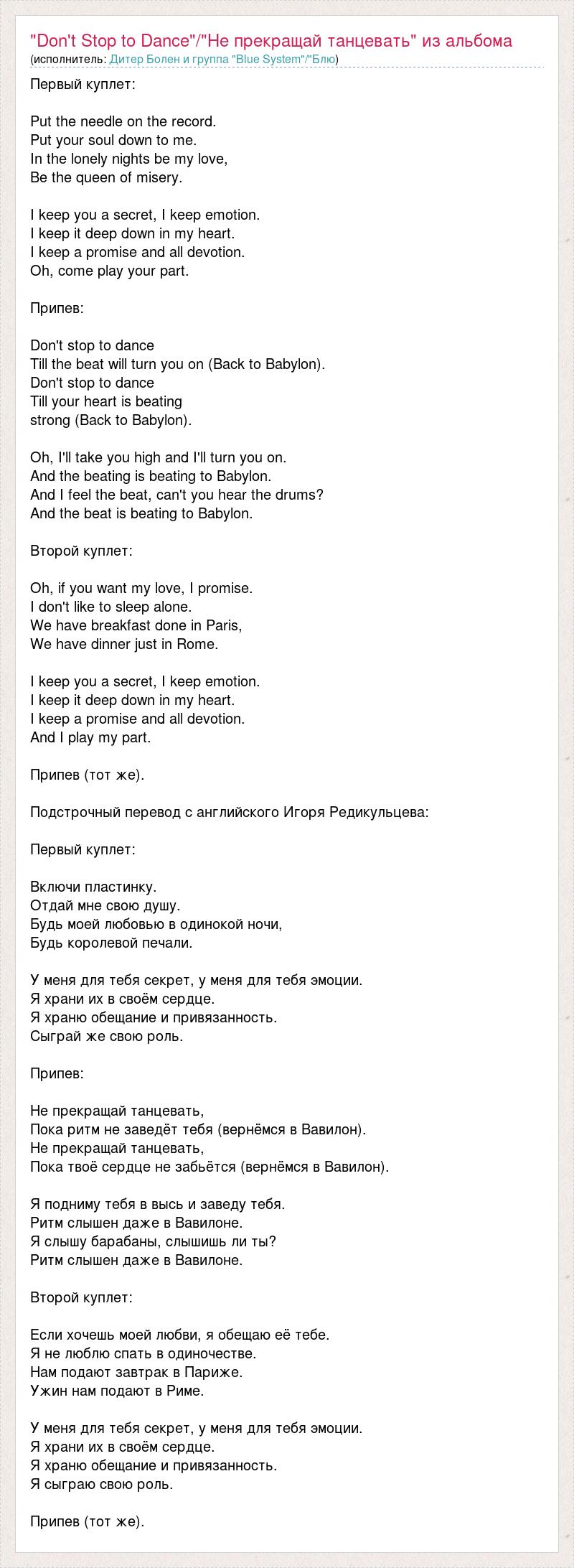 Первый куплет: Put the needle on the record. Put your soul down to me. In the lonely nights be my love, Be the queen of misery. I keep you a secret, I keep emotion. I keep it deep down in my heart. I keep a promise and all devotion. Oh, come play your part. Припев: Don't stop to dance Till the beat will turn you on (Back to Babylon). Don't stop to dance Till your heart is beating strong (Back to Babylon). Oh, I'll take you high and I'll turn you on. And the beating is beating to Babylon. And I feel the beat, can't you hear the drums? And the beat is beating to Babylon. Второй куплет: Oh, if you want my love, I promise. I don't like to sleep alone. We have breakfast done in Paris, We have dinner just in Rome. I keep you a secret, I keep emotion. I keep it deep down in my heart. I keep a promise and all devotion. And I play my part. Припев (тот же). Подстрочный перевод с английского Игоря Редикульцева: Первый куплет: Включи пластинку. Отдай мне свою душу. Будь моей любовью в одинокой ночи, Будь королевой печали. У меня для тебя секрет, у меня для тебя эмоции. Я храни их в своём сердце. Я храню обещание и привязанность. Сыграй же свою роль. Припев: Не прекращай танцевать, Пока ритм не заведёт тебя (вернёмся в Вавилон). Не прекращай танцевать, Пока твоё сердце не забьётся (вернёмся в Вавилон). Я подниму тебя в высь и заведу тебя. Ритм слышен даже в Вавилоне. Я слышу барабаны, слышишь ли ты? Ритм слышен даже в Вавилоне. Второй куплет: Если хочешь моей любви, я обещаю её тебе. Я не люблю спать в одиночестве. Нам подают завтрак в Париже. Ужин нам подают в Риме. У меня для тебя секрет, у меня для тебя эмоции. Я храни их в своём сердце. Я храню обещание и привязанность. Я сыграю свою роль. Припев (тот же).