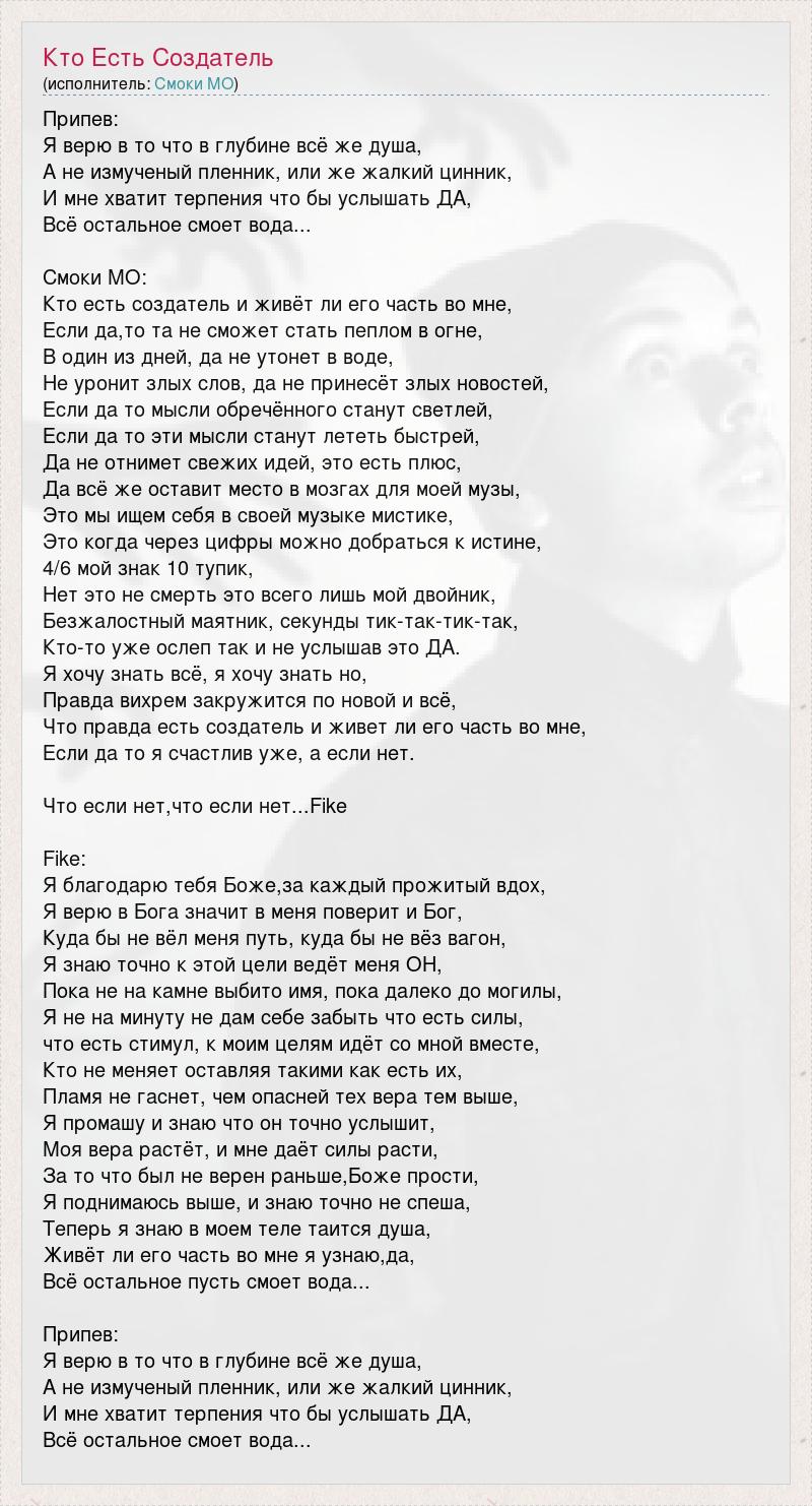 Припев: Я верю в то что в глубине всё же душа, А не измученый пленник, или же жалкий цинник, И мне хватит терпения что бы услышать ДА, Всё остальное смоет вода... Смоки МО: Кто есть создатель и живёт ли его часть во мне, Если да,то та не сможет стать пеплом в огне, В один из дней, да не утонет в воде, Не уронит злых слов, да не принесёт злых новостей, Если да то мысли обречённого станут светлей, Если да то эти мысли станут лететь быстрей, Да не отнимет свежих идей, это есть плюс, Да всё же оставит место в мозгах для моей музы, Это мы ищем себя в своей музыке мистике, Это когда через цифры можно добраться к истине, 4/6 мой знак 10 тупик, Нет это не смерть это всего лишь мой двойник, Безжалостный маятник, секунды тик-так-тик-так, Кто-то уже ослеп так и не услышав это ДА. Я хочу знать всё, я хочу знать но, Правда вихрем закружится по новой и всё, Что правда есть создатель и живет ли его часть во мне, Если да то я счастлив уже, а если нет. Что если нет,что если нет...Fike Fike: Я благодарю тебя Боже,за каждый прожитый вдох, Я верю в Бога значит в меня поверит и Бог, Куда бы не вёл меня путь, куда бы не вёз вагон, Я знаю точно к этой цели ведёт меня ОН, Пока не на камне выбито имя, пока далеко до могилы, Я не на минуту не дам себе забыть что есть силы, что есть стимул, к моим целям идёт со мной вместе, Кто не меняет оставляя такими как есть их, Пламя не гаснет, чем опасней тех вера тем выше, Я промашу и знаю что он точно услышит, Моя вера растёт, и мне даёт силы расти, За то что был не верен раньше,Боже прости, Я поднимаюсь выше, и знаю точно не спеша, Теперь я знаю в моем теле таится душа, Живёт ли его часть во мне я узнаю,да, Всё остальное пусть смоет вода... Припев: Я верю в то что в глубине всё же душа, А не измученый пленник, или же жалкий цинник, И мне хватит терпения что бы услышать ДА, Всё остальное смоет вода...
