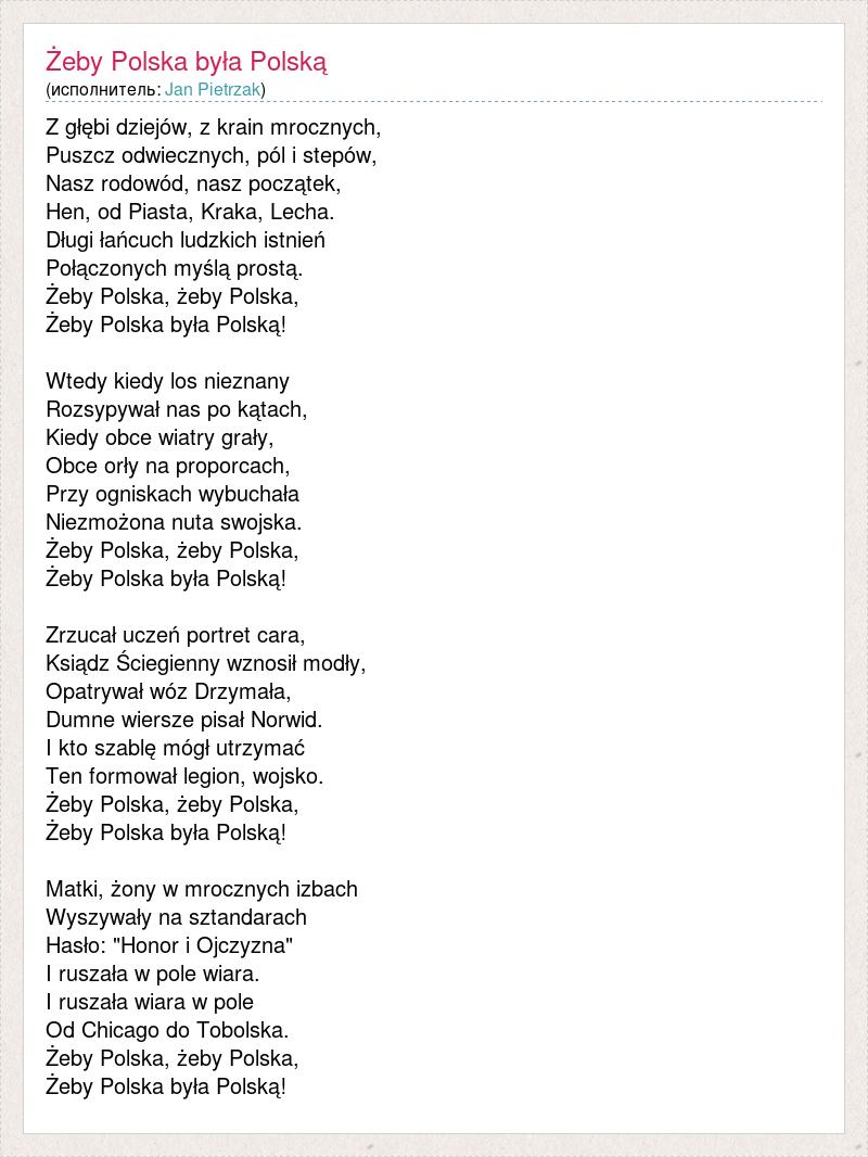 Z głębi dziejów, z krain mrocznych, Puszcz odwiecznych, pól i stepów, Nasz rodowód, nasz początek, Hen, od Piasta, Kraka, Lecha. Długi łańcuch ludzkich istnień Połączonych myślą prostą. Żeby Polska, żeby Polska, Żeby Polska była Polską! Wtedy kiedy los nieznany Rozsypywał nas po kątach, Kiedy obce wiatry grały, Obce orły na proporcach, Przy ogniskach wybuchała Niezmożona nuta swojska. Żeby Polska, żeby Polska, Żeby Polska była Polską! Zrzucał uczeń portret cara, Ksiądz Ściegienny wznosił modły, Opatrywał wóz Drzymała, Dumne wiersze pisał Norwid. I kto szablę mógł utrzymać Ten formował legion, wojsko. Żeby Polska, żeby Polska, Żeby Polska była Polską! Matki, żony w mrocznych izbach Wyszywały na sztandarach Hasło: "Honor i Ojczyzna" I ruszała w pole wiara. I ruszała wiara w pole Od Chicago do Tobolska. Żeby Polska, żeby Polska, Żeby Polska była Polską!