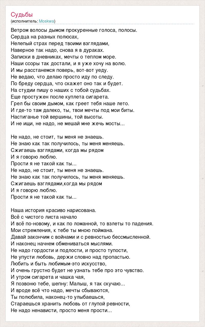 Ветром волосы дымом прокуренные голоса, полосы. Сердца на разных полюсах, Нелепый страх перед твоими взглядами, Наверное так надо, снова я в дураках. Записки в дневниках, мечты о теплом море. Наши ссоры так достали, и я уже хочу на волю. И мы расстанемся поверь, вот-вот уеду. Не ведаю, что делаю просто иду по следу. По бреду сердца, что скажет оно так и будет. На студии пишу о наших с тобой судьбах. Еще простужен после куплета сигарета. Грел бы своим дымом, как греет тебя наше лето. И где-то там далеко, ты, твои мечты под мои биты. Настиганье той вершины, той высоты. И не ищи, не надо, не мешай мне жечь мосты... Не надо, не стоит, ты меня не знаешь. Не знаю как так получилось, ты меня меняешь. Сжигаешь взглядами, когда мы рядом И я говорю люблю. Прости я не такой как ты... Не надо, не стоит, ты меня не знаешь. Не знаю как так получилось, ты меня меняешь. Сжигаешь взглядами,когда мы рядом И я говорю люблю. Прости я не такой как ты... Наша история красиво нарисована. Всё с чистого листа начало И всё по-новому, и как по ломанной, то взлеты то падения. Мои стремления, к тебе ты мною поймана. Давай закончим с войнами и с ревностью бессмысленной. И наконец начнем обмениваться мыслями. Не надо гордости и подлости, и просто тупости, Не упусти любовь, держи словно над пропастью. Любить и быть любимым-это искусство, И очень грустно будет не узнать тебе про это чувство. И утром сигарета и чашка чая, Я позвоню тебе, шепну: Малыш, я так скучаю... И вроде всё что надо, мечты сбываются, Ты полюбила, наконец-то улыбаешься, Стараешься хранить любовь от глупой ревности, Не надо ненависти, просто меня прости...