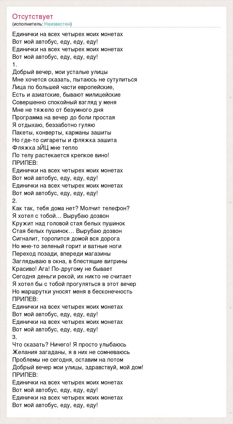 Единички на всех четырех моих монетах Вот мой автобус, еду, еду, еду! Единички на всех четырех моих монетах Вот мой автобус, еду, еду, еду! 1. Добрый вечер, мои усталые улицы Мне хочется сказать, пытаюсь не сутулиться Лица по большей части европейские, Есть и азиатские, бывают милицейские Совершенно спокойный взгляд у меня Мне не тяжело от безумного дня Программа на вечер до боли простая Я отдыхаю, беззаботно гуляю Пакеты, конверты, карманы зашиты Но где-то сигареты и фляжка зашита Фляжка зЙЦ мне тепло По телу растекается крепкое вино! ПРИПЕВ: Единички на всех четырех моих монетах Вот мой автобус, еду, еду, еду! Единички на всех четырех моих монетах Вот мой автобус, еду, еду, еду! 2. Как так, тебя дома нет? Молчит телефон? Я хотел с тобой… Вырубаю дозвон Кружит над головой стая белых пушинок Стая белых пушинок… Вырубаю дозвон Сигналит, торопится домой вся дорога Но мне-то зеленый горит и ватные ноги Переход позади, впереди магазины Заглядываю в окна, в блестящие витрины Красиво! Ага! По-другому не бывает Сегодня деньги рекой, их никто не считает Я хотел бы с тобой прогуляться в этот вечер Но маршрутки уносят меня в бесконечность ПРИПЕВ: Единички на всех четырех моих монетах Вот мой автобус, еду, еду, еду! Единички на всех четырех моих монетах Вот мой автобус, еду, еду, еду! 3. Что сказать? Ничего! Я просто улыбаюсь Желания загаданы, я в них не сомневаюсь Проблемы не сегодня, оставим на потом Добрый вечер мои улицы, здравствуй, мой дом! ПРИПЕВ: Единички на всех четырех моих монетах Вот мой автобус, еду, еду, еду! Единички на всех четырех моих монетах Вот мой автобус, еду, еду, еду!