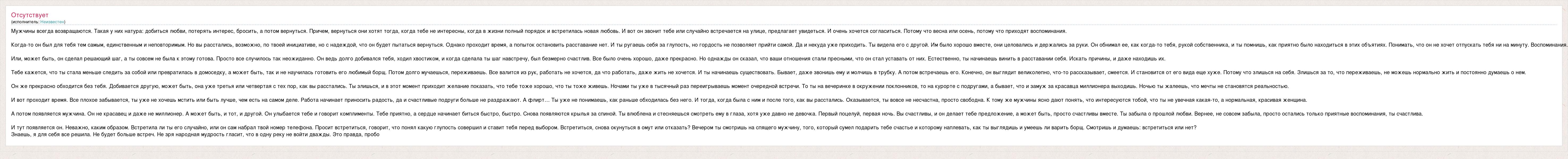 Мужчины всегда возвращаются. Такая у них натура: добиться любви, потерять интерес, бросить, а потом вернуться. Причем, вернуться они хотят тогда, когда тебе не интересны, когда в жизни полный порядок и встретилась новая любовь. И вот он звонит тебе или случайно встречается на улице, предлагает увидеться. И очень хочется согласиться. Потому что весна или осень, потому что приходят воспоминания. Когда-то он был для тебя тем самым, единственным и неповторимым. Но вы расстались, возможно, по твоей инициативе, но с надеждой, что он будет пытаться вернуться. Однако проходит время, а попыток остановить расставание нет. И ты ругаешь себя за глупость, но гордость не позволяет прийти самой. Да и некуда уже приходить. Ты видела его с другой. Им было хорошо вместе, они целовались и держались за руки. Он обнимал ее, как когда-то тебя, рукой собственника, и ты помнишь, как приятно было находиться в этих объятиях. Понимать, что он не хочет отпускать тебя ни на минуту. Воспоминания. Или, может быть, он сделал решающий шаг, а ты совсем не была к этому готова. Просто все случилось так неожиданно. Он ведь долго добивался тебя, ходил хвостиком, и когда сделала ты шаг навстречу, был безмерно счастлив. Все было очень хорошо, даже прекрасно. Но однажды он сказал, что ваши отношения стали пресными, что он стал уставать от них. Естественно, ты начинаешь винить в расставании себя. Искать причины, и даже находишь их. Тебе кажется, что ты стала меньше следить за собой или превратилась в домоседку, а может быть, так и не научилась готовить его любимый борщ. Потом долго мучаешься, переживаешь. Все валится из рук, работать не хочется, да что работать, даже жить не хочется. И ты начинаешь существовать. Бывает, даже звонишь ему и молчишь в трубку. А потом встречаешь его. Конечно, он выглядит великолепно, что-то рассказывает, смеется. И становится от его вида еще хуже. Потому что злишься на себя. Злишься за то, что переживаешь, не можешь нормально жить и постоянно думаешь о нем. Он же прекрасно обходится без тебя. Добивается другую, может быть, она уже третья или четвертая с тех пор, как вы расстались. Ты злишься, и в этот момент приходит желание показать, что тебе тоже хорошо, что ты тоже живешь. Ночами ты уже в тысячный раз переигрываешь момент очередной встречи. То ты на вечеринке в окружении поклонников, то на курорте с подругами, а бывает, что и замуж за красавца миллионера выходишь. Ночью ты жалеешь, что мечты не становятся реальностью. И вот проходит время. Все плохое забывается, ты уже не хочешь мстить или быть лучше, чем есть на самом деле. Работа начинает приносить радость, да и счастливые подруги больше не раздражают. А флирт… Ты уже не понимаешь, как раньше обходилась без него. И тогда, когда была с ним и после того, как вы расстались. Оказывается, ты вовсе не несчастна, просто свободна. К тому же мужчины ясно дают понять, что интересуются тобой, что ты не увечная какая-то, а нормальная, красивая женщина. А потом появляется мужчина. Он не красавец и даже не миллионер. А может быть, и тот, и другой. Он улыбается тебе и говорит комплименты. Тебе приятно, а сердце начинает биться быстро, быстро. Снова появляются крылья за спиной. Ты влюблена и стесняешься смотреть ему в глаза, хотя уже давно не девочка. Первый поцелуй, первая ночь. Вы счастливы, и он делает тебе предложение, а может быть, просто сч