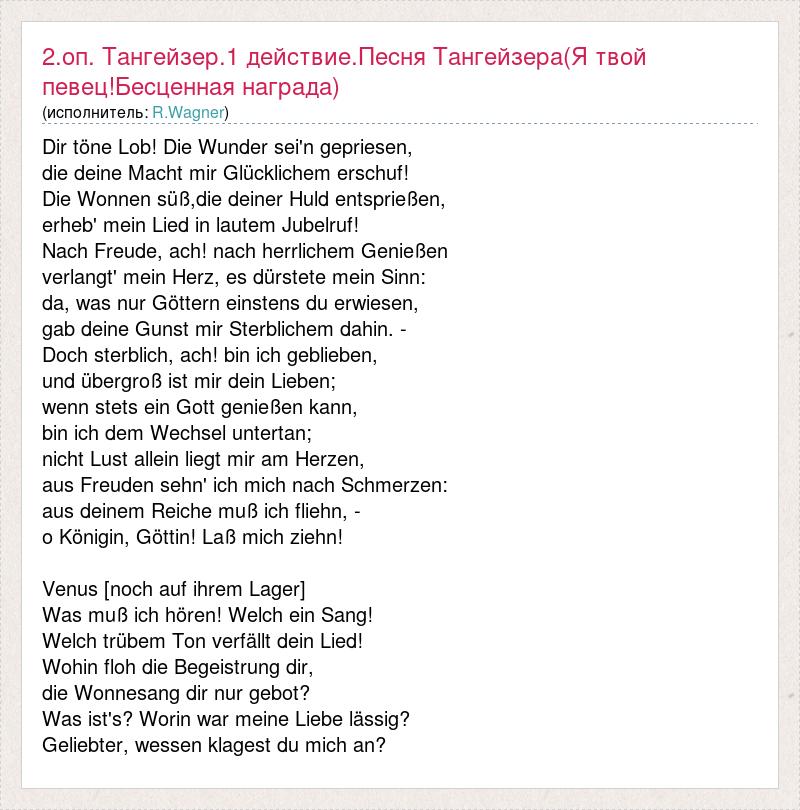 Dir töne Lob! Die Wunder sei'n gepriesen, die deine Macht mir Glücklichem erschuf! Die Wonnen süß,die deiner Huld entsprießen, erheb' mein Lied in lautem Jubelruf! Nach Freude, ach! nach herrlichem Genießen verlangt' mein Herz, es dürstete mein Sinn: da, was nur Göttern einstens du erwiesen, gab deine Gunst mir Sterblichem dahin. - Doch sterblich, ach! bin ich geblieben, und übergroß ist mir dein Lieben; wenn stets ein Gott genießen kann, bin ich dem Wechsel untertan; nicht Lust allein liegt mir am Herzen, aus Freuden sehn' ich mich nach Schmerzen: aus deinem Reiche muß ich fliehn, - o Königin, Göttin! Laß mich ziehn! Venus [noch auf ihrem Lager] Was muß ich hören! Welch ein Sang! Welch trübem Ton verfällt dein Lied! Wohin floh die Begeistrung dir, die Wonnesang dir nur gebot? Was ist's? Worin war meine Liebe lässig? Geliebter, wessen klagest du mich an?
