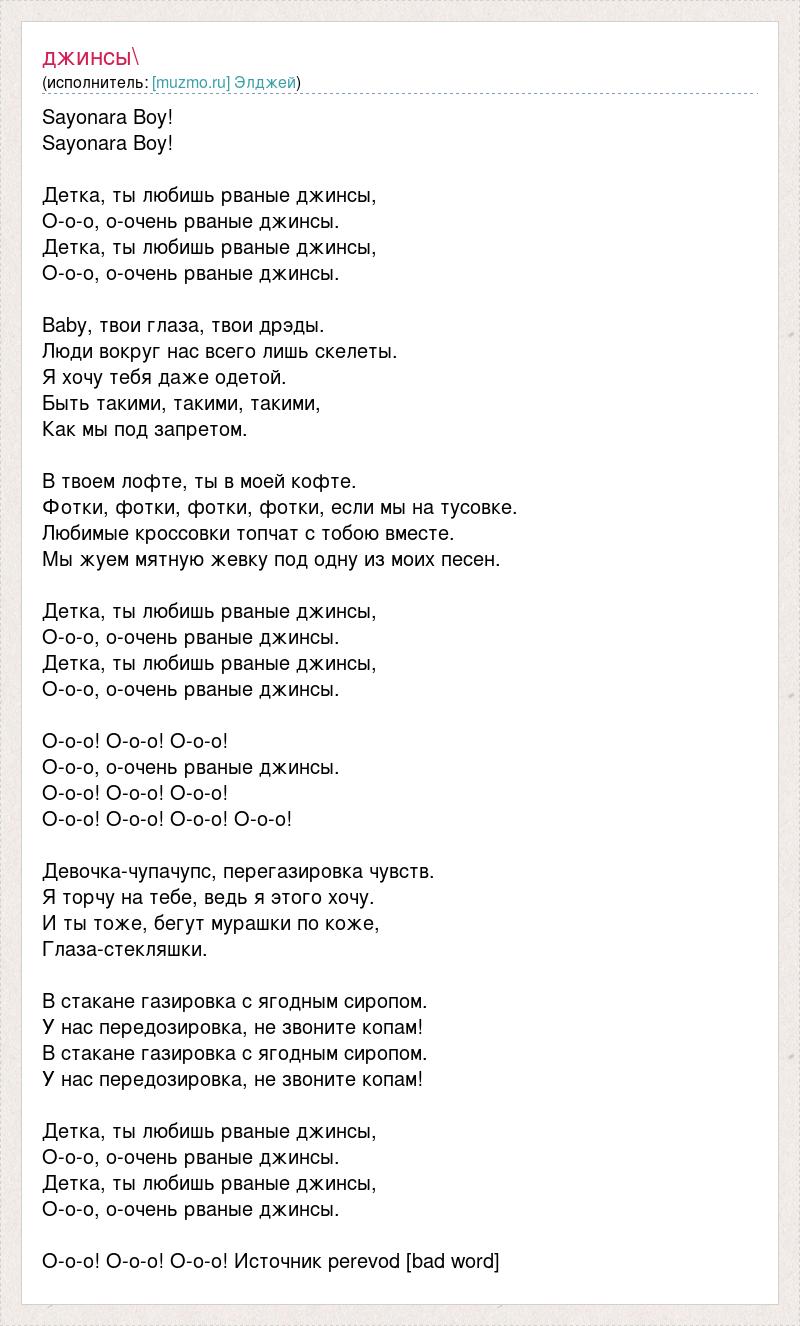 Sayonara Boy! Sayonara Boy! Детка, ты любишь рваные джинсы, О-о-о, о-очень рваные джинсы. Детка, ты любишь рваные джинсы, О-о-о, о-очень рваные джинсы. Baby, твои глаза, твои дрэды. Люди вокруг нас всего лишь скелеты. Я хочу тебя даже одетой. Быть такими, такими, такими, Как мы под запретом. В твоем лофте, ты в моей кофте. Фотки, фотки, фотки, фотки, если мы на тусовке. Любимые кроссовки топчат с тобою вместе. Мы жуем мятную жевку под одну из моих песен. Детка, ты любишь рваные джинсы, О-о-о, о-очень рваные джинсы. Детка, ты любишь рваные джинсы, О-о-о, о-очень рваные джинсы. О-о-о! О-о-о! О-о-о! О-о-о, о-очень рваные джинсы. О-о-о! О-о-о! О-о-о! О-о-о! О-о-о! О-о-о! О-о-о! Девочка-чупачупс, перегазировка чувств. Я торчу на тебе, ведь я этого хочу. И ты тоже, бегут мурашки по коже, Глаза-стекляшки. В стакане газировка с ягодным сиропом. У нас передозировка, не звоните копам! В стакане газировка с ягодным сиропом. У нас передозировка, не звоните копам! Детка, ты любишь рваные джинсы, О-о-о, о-очень рваные джинсы. Детка, ты любишь рваные джинсы, О-о-о, о-очень рваные джинсы. О-о-о! О-о-о! О-о-о! Источник perevod [bad word]