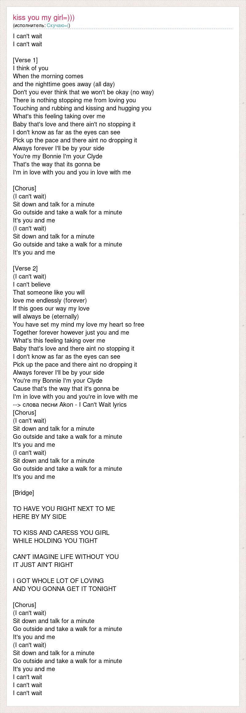 I can't wait I can't wait [Verse 1] I think of you When the morning comes and the nighttime goes away (all day) Don't you ever think that we won't be okay (no way) There is nothing stopping me from loving you Touching and rubbing and kissing and hugging you What's this feeling taking over me Baby that's love and there ain't no stopping it I don't know as far as the eyes can see Pick up the pace and there aint no dropping it Always forever I'll be by your side You're my Bonnie I'm your Clyde That's the way that its gonna be I'm in love with you and you in love with me [Chorus] (I can't wait) Sit down and talk for a minute Go outside and take a walk for a minute It's you and me (I can't wait) Sit down and talk for a minute Go outside and take a walk for a minute It's you and me [Verse 2] (I can't wait) I can't believe That someone like you will love me endlessly (forever) If this goes our way my love will always be (eternally) You have set my mind my love my heart so free Together forever however just you and me What's this feeling taking over me Baby that's love and there aint no stopping it I don't know as far as the eyes can see Pick up the pace and there aint no dropping it Always forever I'll be by your side You're my Bonnie I'm your Clyde Cause that's the way that it's gonna be I'm in love with you and you're in love with me --> слова песни Akon - I Can't Wait lyrics [Chorus] (I can't wait) Sit down and talk for a minute Go outside and take a walk for a minute It's you and me (I can't wait) Sit down and talk for a minute Go outside and take a walk for a minute It's you and me [Bridge] TO HAVE YOU RIGHT NEXT TO ME HERE BY MY SIDE TO KISS AND CARESS YOU GIRL WHILE HOLDING YOU TIGHT CAN'T IMAGINE LIFE WITHOUT YOU IT JUST AIN'T RIGHT I GOT WHOLE LOT OF LOVING AND YOU GONNA GET IT TONIGHT [Chorus] (I can't wait) Sit down and talk for a minute Go outside and take a walk for a minute It's you and me (I can't wait) Sit down and talk for a minute Go outside and take a walk for a minute It's you and me I can't wait I can't wait I can't wait