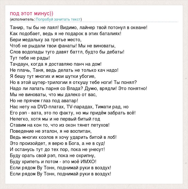Танир, ты бы не лаял! Видимо, лайнер твой потонул в океане! Как подобает, ведь я не подарок в этих баталиях! Бери медальку за третье место, Чтоб не рыдали твои фанаты! Мы не виноваты, Слов водопады туго давят баттл, будто бы дебаты! Тут тебе не рады! Тачдаун, когда я доставляю панч на дом! Не плачь, Таня, ведь делать не только кач надо! Я бешу тут многих и мои шутки убогие, Но в этой шутер-трилогии я откушу тебе ноги! Ты понял? Надо ли лапать парня со Влада? Думю, врядли! Это понятно! Мы не виноваты, что мы далеко от вас, Но не прячем глаз под аватар! Нас нету на DVD-платах, TV-парадах, Тимати рад, но Его рэп - вата, это по факту, но мы придём забрать всё! Нелегко, хотя мы и не первый битый год Ставим на кон то, что из окон тянет петухов! Поведение не эталон, я не воспитан, Ведь многих козлов я хочу ударить битой в лоб! Это произойдет, я верю в Бога, а не в суд! И останусь тут до тех пор, пока не унесут! Буду орать свой рэп, пока не охрипну, Буду хрипеть и потом - это моё ИМХО! Если рядом Ву Тонн, поднимай руки в воздух! Если рядом Ву Тонн, поднимай руки в воздух!