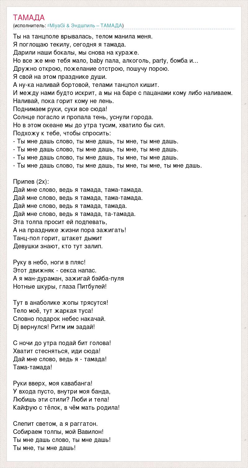 Ты на танцполе врывалась, телом манила меня. Я поглощаю текилу, сегодня я тамада. Дарили наши бокалы, мы снова на кураже. Но все же мне тебя мало, baby пала, алкоголь, party, бомба и... Дружно открою, пожелание отстрою, пошучу порою. Я свой на этом празднике души. А ну-ка наливай бортовой, телами танцпол кишит. И между нами будто искрит, а мы на баре с пацанами кому либо наливаем. Наливай, пока горит кому не лень. Поднимаем руки, суки все сюда! Солнце погасло и пропала тень, уснули города. Но в этом океане мы до утра тусим, хватило бы сил. Подхожу к тебе, чтобы спросить: - Ты мне дашь слово, ты мне дашь, ты мне, ты мне дашь. - Ты мне дашь слово, ты мне дашь, ты мне, ты мне дашь. - Ты мне дашь слово, ты мне дашь, ты мне, ты мне дашь. - Ты мне дашь слово, ты мне дашь, ты мне, ты мне, ты мне дашь. Припев (2x): Дай мне слово, ведь я тамада, тама-тамада. Дай мне слово, ведь я тамада, тама-тамада. Дай мне слово, ведь я тамада, тамада. Дай мне слово, ведь я тамада, та-тамада. Эта толпа просит ей подпевать, А на празднике жизни пора зажигать! Танц-пол горит, штакет дымит Девушки знают, кто тут залип. Руку в небо, ноги в пляс! Этот движняк - секса напас. А я ман-дураман, зажигай бэйба-пуля Нотные шкуры, глаза Питбулей! Тут в анаболике жопы трясутся! Тело моё, тут жаркая туса! Словно подарок небес накачай. Dj вернулся! Ритм им задай! С ночи до утра подай бит голова! Хватит стесняться, иди сюда! Дай мне слово, ведь я - тамада! Тама-тамада! Руки вверх, моя кавабанга! У входа пусто, внутри моя банда, Любишь эти стили? Люби и тела! Кайфую с тёлок, в чём мать родила! Слепит светом, а я раггатон. Собираем толпы, мой Вавилон! Ты мне дашь слово, ты мне дашь! Ты мне, ты мне дашь!