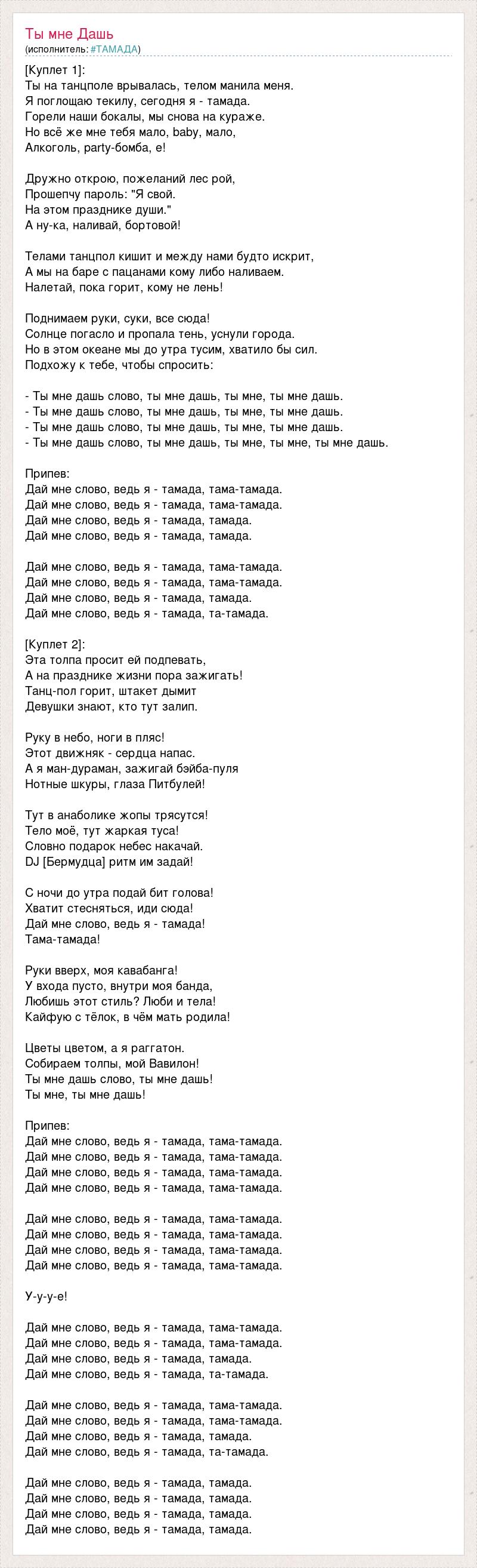 [Куплет 1]: Ты на танцполе врывалась, телом манила меня. Я поглощаю текилу, сегодня я - тамада. Горели наши бокалы, мы снова на кураже. Но всё же мне тебя мало, baby, мало, Алкоголь, party-бомба, е! Дружно открою, пожеланий лес рой, Прошепчу пароль: "Я свой. На этом празднике души." А ну-ка, наливай, бортовой! Телами танцпол кишит и между нами будто искрит, А мы на баре с пацанами кому либо наливаем. Налетай, пока горит, кому не лень! Поднимаем руки, суки, все сюда! Солнце погасло и пропала тень, уснули города. Но в этом океане мы до утра тусим, хватило бы сил. Подхожу к тебе, чтобы спросить: - Ты мне дашь слово, ты мне дашь, ты мне, ты мне дашь. - Ты мне дашь слово, ты мне дашь, ты мне, ты мне дашь. - Ты мне дашь слово, ты мне дашь, ты мне, ты мне дашь. - Ты мне дашь слово, ты мне дашь, ты мне, ты мне, ты мне дашь. Припев: Дай мне слово, ведь я - тамада, тама-тамада. Дай мне слово, ведь я - тамада, тама-тамада. Дай мне слово, ведь я - тамада, тамада. Дай мне слово, ведь я - тамада, тамада. Дай мне слово, ведь я - тамада, тама-тамада. Дай мне слово, ведь я - тамада, тама-тамада. Дай мне слово, ведь я - тамада, тамада. Дай мне слово, ведь я - тамада, та-тамада. [Куплет 2]: Эта толпа просит ей подпевать, А на празднике жизни пора зажигать! Танц-пол горит, штакет дымит Девушки знают, кто тут залип. Руку в небо, ноги в пляс! Этот движняк - сердца напас. А я ман-дураман, зажигай бэйба-пуля Нотные шкуры, глаза Питбулей! Тут в анаболике жопы трясутся! Тело моё, тут жаркая туса! Словно подарок небес накачай. DJ [Бермудца] ритм им задай! С ночи до утра подай бит голова! Хватит стесняться, иди сюда! Дай мне слово, ведь я - тамада! Тама-тамада! Руки вверх, моя кавабанга! У входа пусто, внутри моя банда, Любишь этот стиль? Люби и тела! Кайфую с тёлок, в чём мать родила! Цветы цветом, а я раггатон. Собираем толпы, мой Вавилон! Ты мне дашь слово, ты мне дашь! Ты мне, ты мне дашь! Припев: Дай мне слово, ведь я - тамада, тама-тамада. Дай мне слово, ведь я - тамада, тама-тамада. Дай мне слово, ведь я - тамада, тама-тамада. Дай мне слово, ведь я - тамада, тама-тамада. Дай мне слово, ведь я - тамада, тама-тамада. Дай мне слово, ведь я - тамада, тама-тамада. Дай мне слово, ведь я - тамада, тама-тамада. Дай мне слово, ведь я - тамада, тама-тамада. У-у-у-е! Дай мне слово, ведь я - тамада, тама-тамада. Дай мне слово, ведь я - тамада, тама-тамада. Дай мне слово, ведь я - тамада, тамада. Дай мне слово, ведь я - тамада, та-тамада. Дай мне слово, ведь я - тамада, тама-тамада. Дай мне слово, ведь я - тамада, тама-тамада. Дай мне слово, ведь я - тамада, тамада. Дай мне слово, ведь я - тамада, та-тамада. Дай мне слово, ведь я - тамада, тамада. Дай мне слово, ведь я - тамада, тамада. Дай мне слово, ведь я - тамада, тамада. Дай мне слово, ведь я - тамада, тамада.