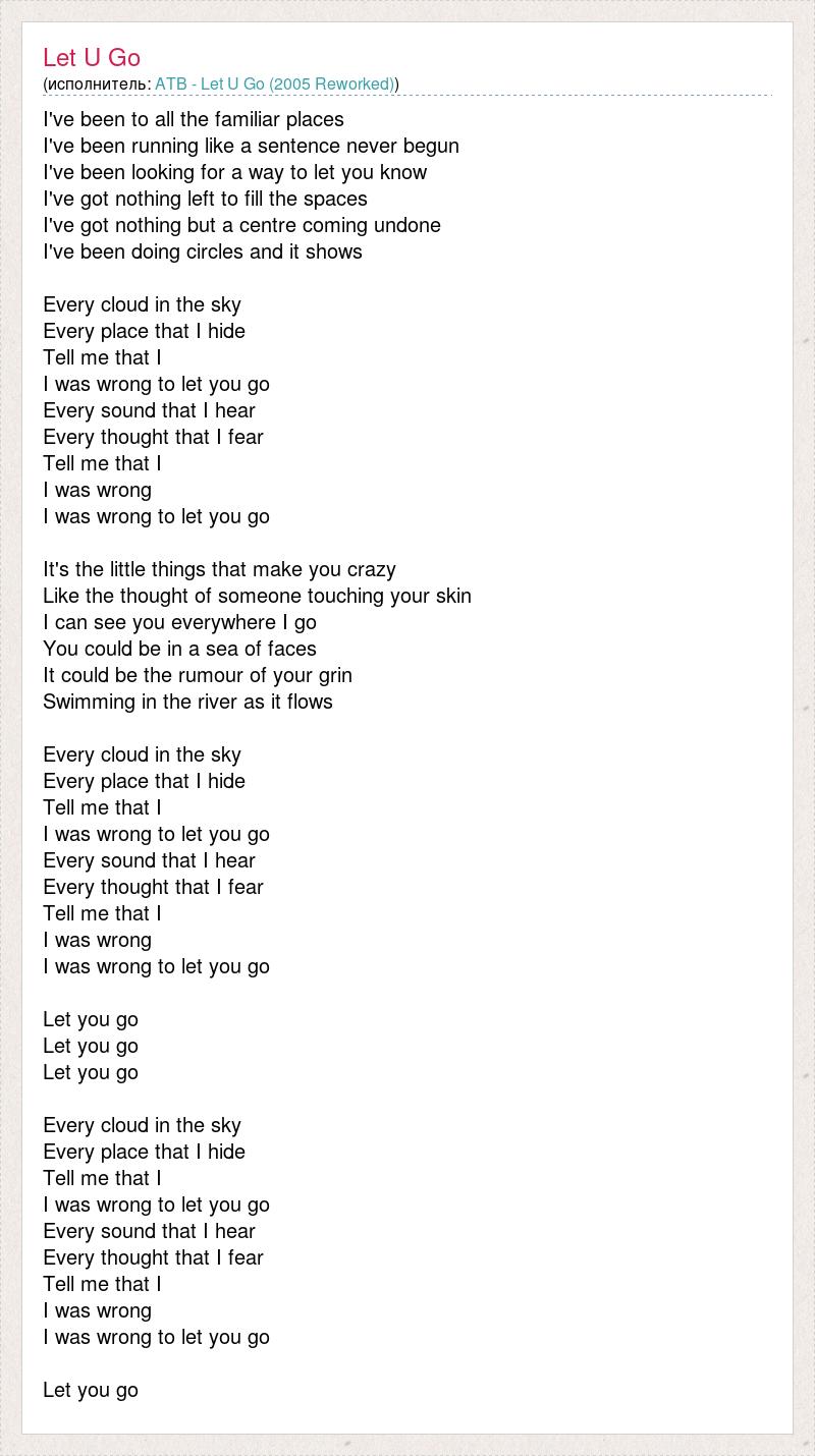 I've been to all the familiar places I've been running like a sentence never begun I've been looking for a way to let you know I've got nothing left to fill the spaces I've got nothing but a centre coming undone I've been doing circles and it shows Every cloud in the sky Every place that I hide Tell me that I I was wrong to let you go Every sound that I hear Every thought that I fear Tell me that I I was wrong I was wrong to let you go It's the little things that make you crazy Like the thought of someone touching your skin I can see you everywhere I go You could be in a sea of faces It could be the rumour of your grin Swimming in the river as it flows Every cloud in the sky Every place that I hide Tell me that I I was wrong to let you go Every sound that I hear Every thought that I fear Tell me that I I was wrong I was wrong to let you go Let you go Let you go Let you go Every cloud in the sky Every place that I hide Tell me that I I was wrong to let you go Every sound that I hear Every thought that I fear Tell me that I I was wrong I was wrong to let you go Let you go