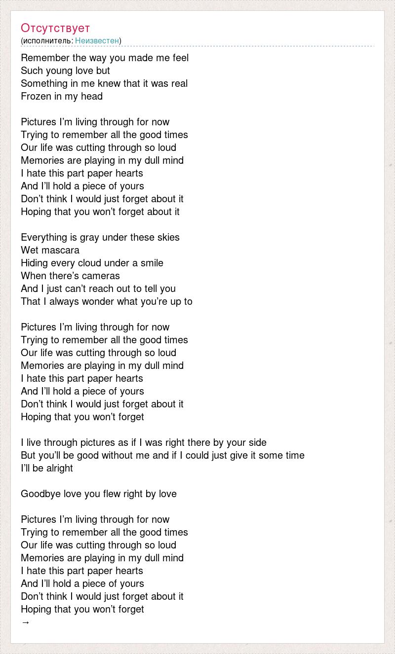 Remember the way you made me feel Such young love but Something in me knew that it was real Frozen in my head Pictures I’m living through for now Trying to remember all the good times Our life was cutting through so loud Memories are playing in my dull mind I hate this part paper hearts And I’ll hold a piece of yours Don’t think I would just forget about it Hoping that you won’t forget about it Everything is gray under these skies Wet mascara Hiding every cloud under a smile When there’s cameras And I just can’t reach out to tell you That I always wonder what you’re up to Pictures I’m living through for now Trying to remember all the good times Our life was cutting through so loud Memories are playing in my dull mind I hate this part paper hearts And I’ll hold a piece of yours Don’t think I would just forget about it Hoping that you won’t forget I live through pictures as if I was right there by your side But you’ll be good without me and if I could just give it some time I’ll be alright Goodbye love you flew right by love Pictures I’m living through for now Trying to remember all the good times Our life was cutting through so loud Memories are playing in my dull mind I hate this part paper hearts And I’ll hold a piece of yours Don’t think I would just forget about it Hoping that you won’t forget →