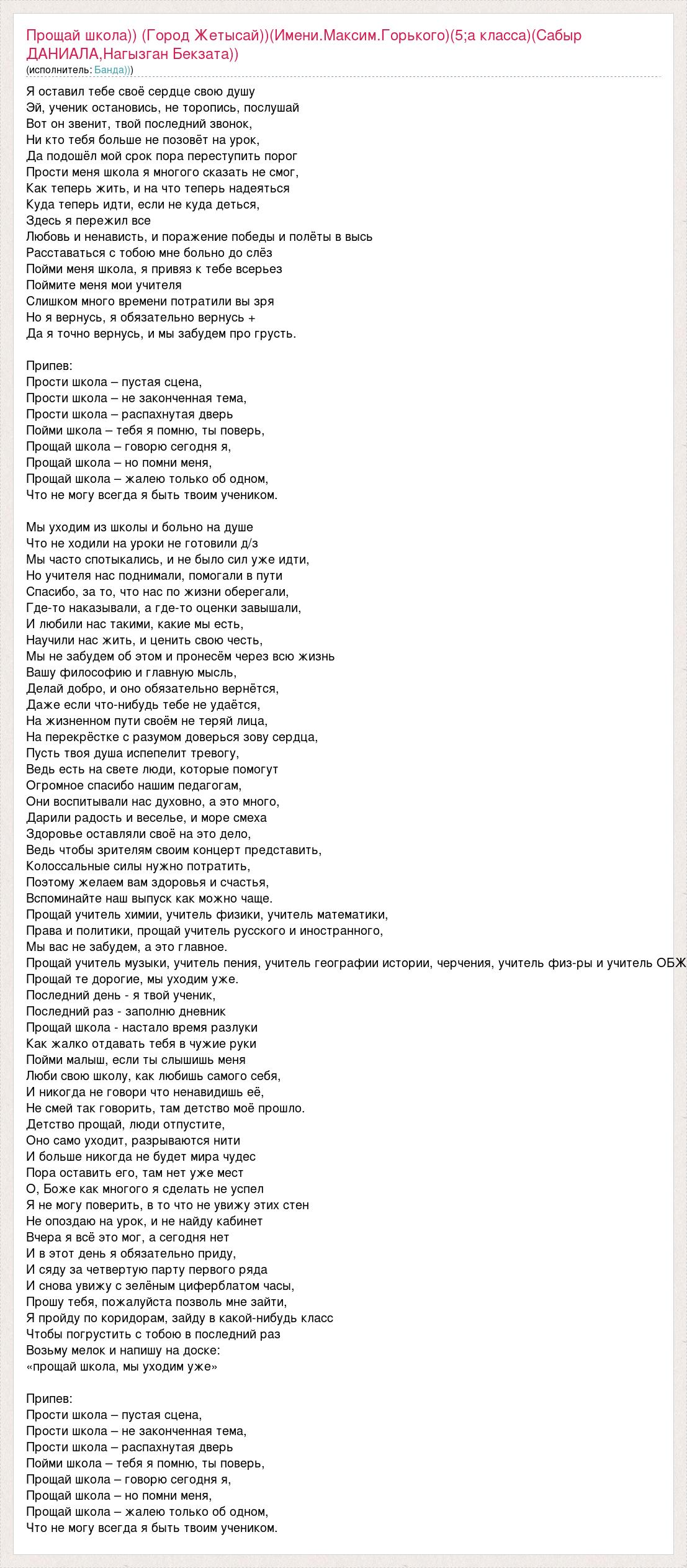 Я оставил тебе своё сердце свою душу Эй, ученик остановись, не торопись, послушай Вот он звенит, твой последний звонок, Ни кто тебя больше не позовёт на урок, Да подошёл мой срок пора переступить порог Прости меня школа я многого сказать не смог, Как теперь жить, и на что теперь надеяться Куда теперь идти, если не куда деться, Здесь я пережил все Любовь и ненависть, и поражение победы и полёты в высь Расставаться с тобою мне больно до слёз Пойми меня школа, я привяз к тебе всерьез Поймите меня мои учителя Слишком много времени потратили вы зря Но я вернусь, я обязательно вернусь + Да я точно вернусь, и мы забудем про грусть. Припев: Прости школа – пустая сцена, Прости школа – не законченная тема, Прости школа – распахнутая дверь Пойми школа – тебя я помню, ты поверь, Прощай школа – говорю сегодня я, Прощай школа – но помни меня, Прощай школа – жалею только об одном, Что не могу всегда я быть твоим учеником. Мы уходим из школы и больно на душе Что не ходили на уроки не готовили д/з Мы часто спотыкались, и не было сил уже идти, Но учителя нас поднимали, помогали в пути Спасибо, за то, что нас по жизни оберегали, Где-то наказывали, а где-то оценки завышали, И любили нас такими, какие мы есть, Научили нас жить, и ценить свою честь, Мы не забудем об этом и пронесём через всю жизнь Вашу философию и главную мысль, Делай добро, и оно обязательно вернётся, Даже если что-нибудь тебе не удаётся, На жизненном пути своём не теряй лица, На перекрёстке с разумом доверься зову сердца, Пусть твоя душа испепелит тревогу, Ведь есть на свете люди, которые помогут Огромное спасибо нашим педагогам, Они воспитывали нас духовно, а это много, Дарили радость и веселье, и море смеха Здоровье оставляли своё на это дело, Ведь чтобы зрителям своим концерт представить, Колоссальные силы нужно потратить, Поэтому желаем вам здоровья и счастья, Вспоминайте наш выпуск как можно чаще. Прощай учитель химии, учитель физики, учитель математики, Права и политики, прощай учитель русского и иностранного, Мы вас не забудем, а это главное. Прощай учитель музыки, учитель пения, учитель географии истории, черчения, учитель физ-ры и учитель ОБЖ Прощай те дорогие, мы уходим уже. Последний день - я твой ученик, Последний раз - заполню дневник Прощай школа - настало время разлуки Как жалко отдавать тебя в чужие руки Пойми малыш, если ты слышишь меня Люби свою школу, как любишь самого себя, И никогда не говори что ненавидишь её, Не смей так говорить, там детство моё прошло. Детство прощай, люди отпустите, Оно само уходит, разрываются нити И больше никогда не будет мира чудес Пора оставить его, там нет уже мест О, Боже как многого я сделать не успел Я не могу поверить, в то что не увижу этих стен Не опоздаю на урок, и не найду кабинет Вчера я всё это мог, а сегодня нет И в этот день я обязательно приду, И сяду за четвертую парту первого ряда И снова увижу с зелёным циферблатом часы, Прошу тебя, пожалуйста позволь мне зайти, Я пройду по коридорам, зайду в какой-нибудь класс Чтобы погрустить с тобою в последний раз Возьму мелок и напишу на доске: «прощай школа, мы уходим уже» Припев: Прости школа – пустая сцена, Прости школа – не законченная тема, Прости школа – распахнутая дверь Пойми школа – тебя я помню, ты поверь, Прощай школа – говорю сегодня я, Прощай школа – но помни меня, Прощай школа – жалею только об одном, Что не м