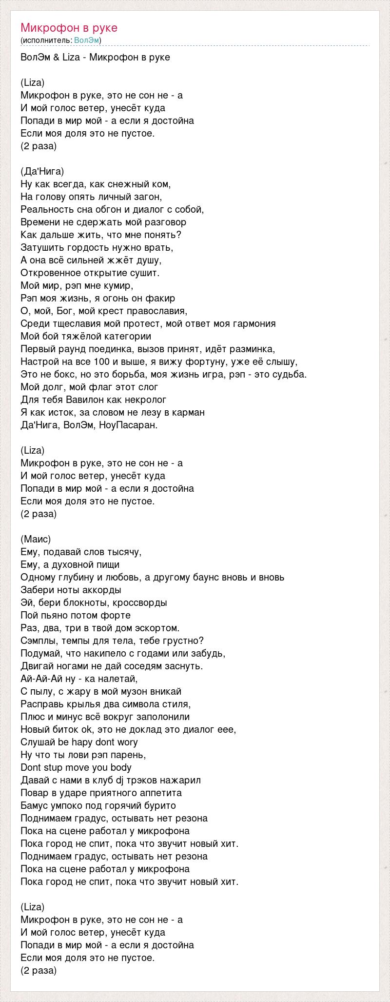 ВолЭм & Liza - Микрофон в руке (Liza) Микрофон в руке, это не сон не - а И мой голос ветер, унесёт куда Попади в мир мой - а если я достойна Если моя доля это не пустое. (2 раза) (Да'Нига) Ну как всегда, как снежный ком, На голову опять личный загон, Реальность сна обгон и диалог с собой, Времени не сдержать мой разговор Как дальше жить, что мне понять? Затушить гордость нужно врать, А она всё сильней жжёт душу, Откровенное открытие сушит. Мой мир, рэп мне кумир, Рэп моя жизнь, я огонь он факир О, мой, Бог, мой крест православия, Среди тщеславия мой протест, мой ответ моя гармония Мой бой тяжёлой категории Первый раунд поединка, вызов принят, идёт разминка, Настрой на все 100 и выше, я вижу фортуну, уже её слышу, Это не бокс, но это борьба, моя жизнь игра, рэп - это судьба. Мой долг, мой флаг этот слог Для тебя Вавилон как некролог Я как исток, за словом не лезу в карман Да'Нига, ВолЭм, НоуПасаран. (Liza) Микрофон в руке, это не сон не - а И мой голос ветер, унесёт куда Попади в мир мой - а если я достойна Если моя доля это не пустое. (2 раза) (Маис) Ему, подавай слов тысячу, Ему, а духовной пищи Одному глубину и любовь, а другому баунс вновь и вновь Забери ноты аккорды Эй, бери блокноты, кроссворды Пой пьяно потом форте Раз, два, три в твой дом эскортом. Сэмплы, темпы для тела, тебе грустно? Подумай, что накипело с годами или забудь, Двигай ногами не дай соседям заснуть. Ай-Ай-Ай ну - ка налетай, С пылу, с жару в мой музон вникай Расправь крылья два символа стиля, Плюс и минус всё вокруг заполонили Новый биток ok, это не доклад это диалог еее, Слушай be hapy dont wory Ну что ты лови рэп парень, Dont stup move you body Давай с нами в клуб dj трэков нажарил Повар в ударе приятного аппетита Бамус умпоко под горячий бурито Поднимаем градус, остывать нет резона Пока на сцене работал у микрофона Пока город не спит, пока что звучит новый хит. Поднимаем градус, остывать нет резона Пока на сцене работал у микрофона Пока город не спит, пока что звучит новый хит. (Liza) Микрофон в руке, это не сон не - а И мой голос ветер, унесёт куда Попади в мир мой - а если я достойна Если моя доля это не пустое. (2 раза)
