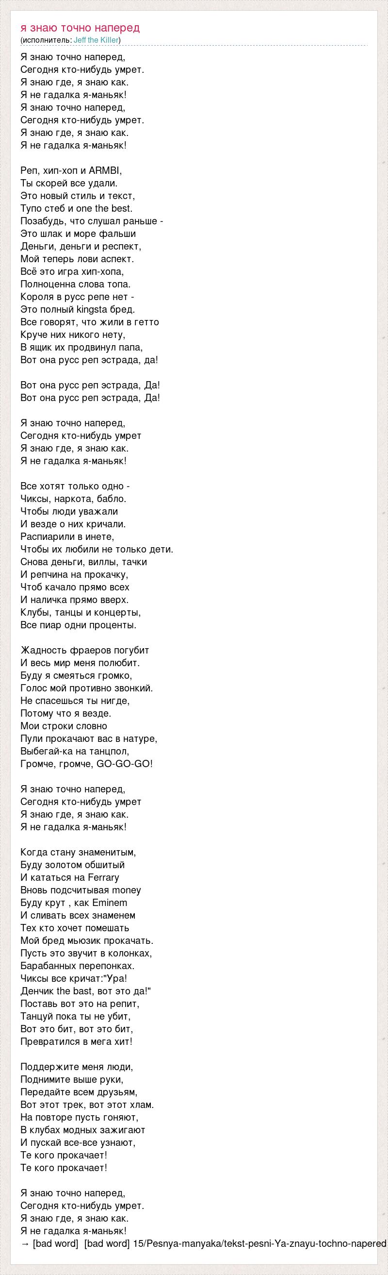 Я знаю точно наперед, Сегодня кто-нибудь умрет. Я знаю где, я знаю как. Я не гадалка я-маньяк! Я знаю точно наперед, Сегодня кто-нибудь умрет. Я знаю где, я знаю как. Я не гадалка я-маньяк! Реп, хип-хоп и ARMBI, Ты скорей все удали. Это новый стиль и текст, Тупо стеб и one the best. Позабудь, что слушал раньше - Это шлак и море фальши Деньги, деньги и респект, Мой теперь лови аспект. Всё это игра хип-хопа, Полноценна слова топа. Короля в русс репе нет - Это полный kingsta бред. Все говорят, что жили в гетто Круче них никого нету, В ящик их продвинул папа, Вот она русс реп эстрада, да! Вот она русс реп эстрада, Да! Вот она русс реп эстрада, Да! Я знаю точно наперед, Сегодня кто-нибудь умрет Я знаю где, я знаю как. Я не гадалка я-маньяк! Все хотят только одно - Чиксы, наркота, бабло. Чтобы люди уважали И везде о них кричали. Распиарили в инете, Чтобы их любили не только дети. Снова деньги, виллы, тачки И репчина на прокачку, Чтоб качало прямо всех И наличка прямо вверх. Клубы, танцы и концерты, Все пиар одни проценты. Жадность фраеров погубит И весь мир меня полюбит. Буду я смеяться громко, Голос мой противно звонкий. Не спасешься ты нигде, Потому что я везде. Мои строки словно Пули прокачают вас в натуре, Выбегай-ка на танцпол, Громче, громче, GO-GO-GO! Я знаю точно наперед, Сегодня кто-нибудь умрет Я знаю где, я знаю как. Я не гадалка я-маньяк! Когда стану знаменитым, Буду золотом обшитый И кататься на Ferrary Вновь подсчитывая monеy Буду крут , как Eminem И сливать всех знаменем Тех кто хочет помешать Мой бред мьюзик прокачать. Пусть это звучит в колонках, Барабанных перепонках. Чиксы все кричат:"Ура! Денчик the bast, вот это да!" Поставь вот это на репит, Танцуй пока ты не убит, Вот это бит, вот это бит, Превратился в мега хит! Поддержите меня люди, Поднимите выше руки, Передайте всем друзьям, Вот этот трек, вот этот хлам. На повторе пусть гоняют, В клубах модных зажигают И пускай все-все узнают, Те кого прокачает! Те кого прокачает! Я знаю точно наперед, Сегодня кто-нибудь умрет. Я знаю где, я знаю как. Я не гадалка я-маньяк! → [bad word] [bad word] 15/Pesnya-manyaka/tekst-pesni-Ya-znayu-tochno-napered